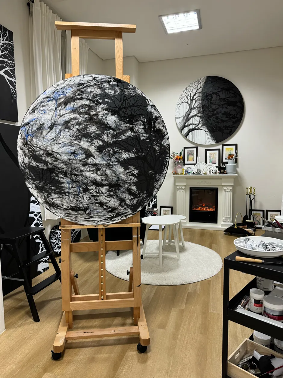이민진/상림월 <想林月> 바람 부는 날의 사색하는 숲에 뜬 달/원형 캔버스에 혼합재료/지름 100cm/2024/5,400,000