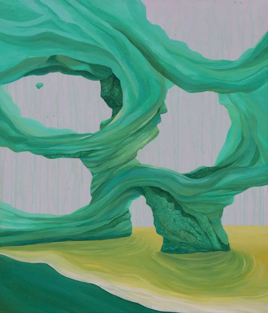 그림 속 협곡을 연상케 하는 형태는 나의 생각이자 불안이다. 그 둘은 억지로 떼어낼 수 없고, 서로에게 영향을 주며, 자라나고, 거대해지고, 층을 이루며 쌓인다. 무겁고 괴롭게 느껴질 때도 있지만 사실 이것들은 매우 유연하고 공허하기도 하다. 내가 어떻게 다루느냐에 달려있어 다채로운 형태를 띤다. 또한, 내 것이기에 내가 다룰 수 있다는 확신을 갖는다면 내 시야를 넘어서지 않는다. 그러나, 불안에 압도되어 버린다면 그 크기는 나조차도 짐작할 수 없어진다. 반복해서 등장하는 눈과 입을 가진 덩어리는 연쇄하는 생각들에게서 한 발짝 멀어져, 눈을 감고 입을 다문 채, 마음이 가라앉길 바라는 나의 소망이자 태도이다.