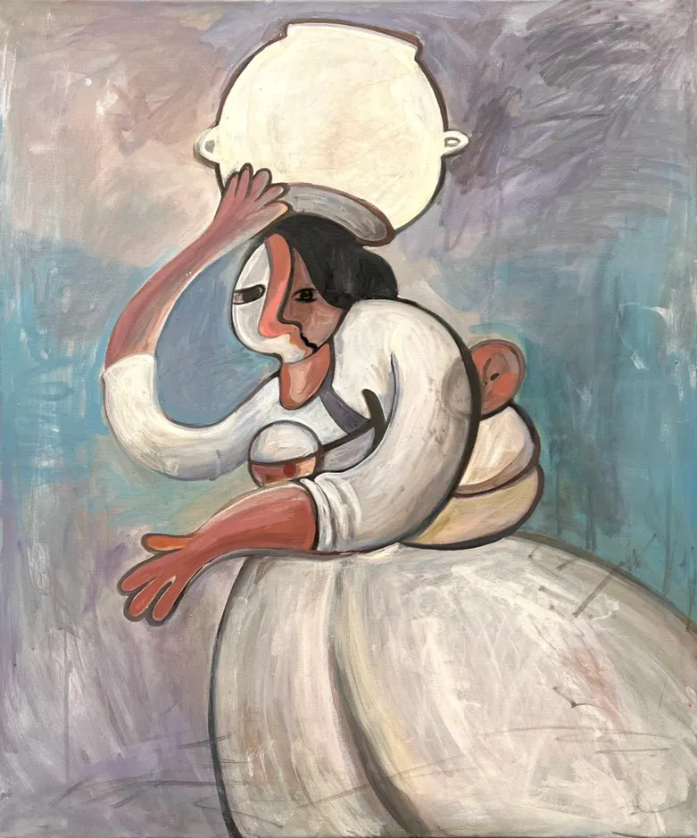 고대에는 한국의 조상들이 종종 어깨에 가방을 메고 다녔다. 오늘날 사람들은 눈에 보이지 않는 가방을 들고 다니는데, 그 크기와 무게는 각기 다르다. 하지만 과거와 달리, 현대의 짐은 마음의 무게로만 느껴지며, 예전의 눈에 보이는 무거운 짐과는 다르다. 그러한 마음의 짐을 짊어진 여성을 항아리의 형태와 그림으로 표현했는데, 이는 한국의 미덕을 현대적인 시각으로 재해석한 결과이다. 나는 이 무게가 마음의 조화에 따라 변하는 모습을 상상하게 된다.