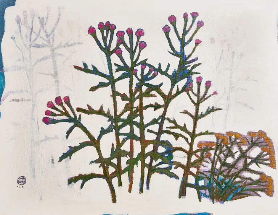 안혜원 / 엉겅퀴와 씀바귀 / 캔버스위 백토,아크릴혼합재료 / 116.8ⅹ91 / 2023 / 750만원