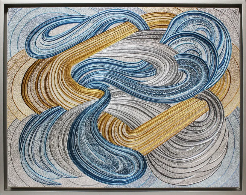 비단천 위에 실을 엮는 과정은 엉키고 풀리는 삶의 여정을 떠올리게 합니다. 가는 실이 엉키고 풀리며 하나의 형태를 이루듯,