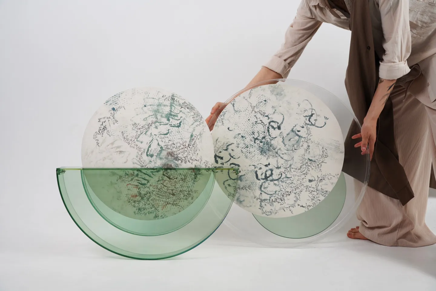 초록달1(왼쪽), 한지에 수묵채색 및 아크릴판, 60x60x6cm, 2022