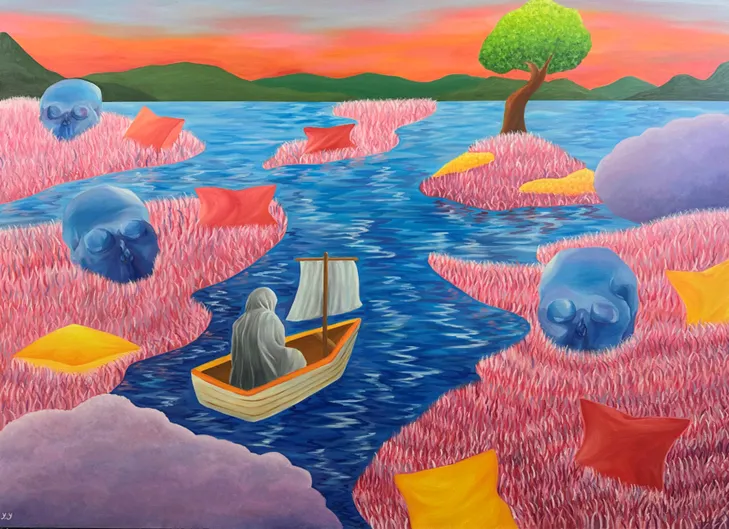 작품의 배경은 삼도천으로 전통적으로 이승과 저승의 경계로 여겨지는 이 강은 이번 작업에서 현실과 휴식의 세계를 구분짓은 상징적 공간으로 설정되었다. 강 위에 천천히 건너는 배에는 영혼이 한명 탑승하여 있다. 그 영혼은 더이상 현실에 매여있지 않고 조용하고 방해받지 않는 자신만의 휴식처로 향해 나가가고 있다.
