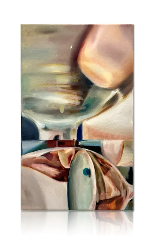 시각적 영감은 어느 날 와인잔을 통해 세상을 바라보며 시작되었습니다. 작은 오브제 안에도 굴절과 왜곡이 숨어 있어, 각도에 따라 장면이 조금씩 달라집니다. 이 경험은 마치 오늘날 각자만의 목소리가 뒤섞이지 않고 공존하는 현대 사회의 풍경과 닮아 있다고 느꼈습니다. 가까이 다가갈수록 형상과 추상은 현실로부터 동 떨어진 채 멀리 떠다니며, 색과 분위기는 아름답지만 동시에 이미지의 현혹성과 소통의 모순을 시사합니다.