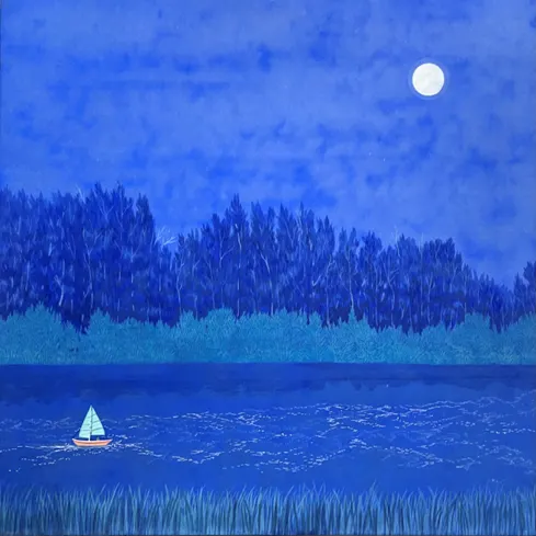 <그곳으로 가네> 그림의 하늘에는 환한 달이 떠 있습니다. 잔잔한 물 위에 떠 있는 작은 배는 어딘가로 떠나는 순간을 의미합니다. 달은 곁에 있지만 닿을 수 없는 존재이며, 배는 멀어지지만 목적지를 향해 천천히 나아가고 있습니다. 이러한 움직임은 삶에서 필요한 이별, 그리고 새로운 길로 나아가는 용기를 상징합니다. 누구나 한번쯤 경험했을 삶에서의 헤어짐, 그리움, 떠나는 이의 마음을 고요하게 담고자 했습니다.