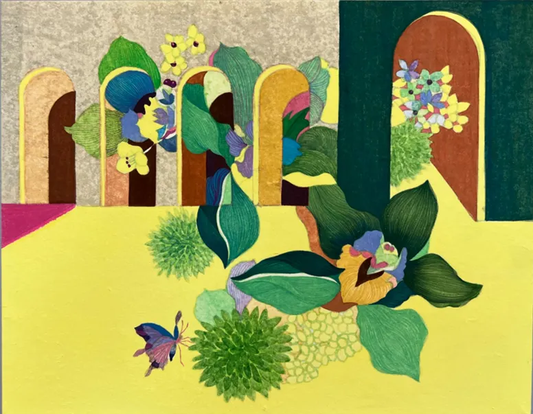 여기서 구조는 더 이상 무언가를 가두지 않는다 — 그 자체로 열려 있다. 아치들은 여전히 남아 있지만, 그 경계는 부드러워진다. 꽃잎과 잎사귀는 프레임 너머로 뻗어가고, 나비는 도망치듯이 아니라, 머물듯이 춤춘다.