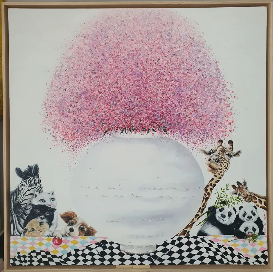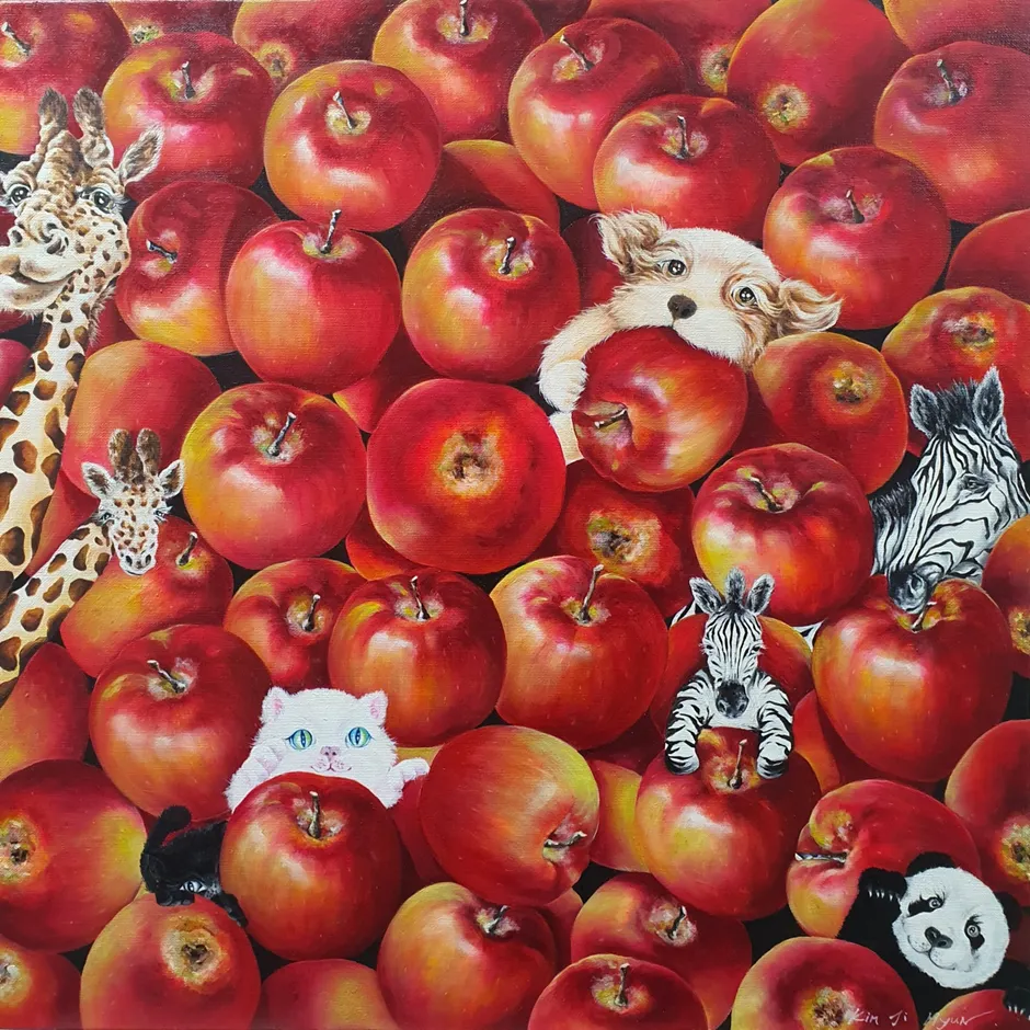또한 둥근 사과를 중심으로 배치된 동물들은 현실과 상상의 경계를 넘나드는 따뜻한 시각적 장치로 유토피아적 공존의 상상력을 환기합니다. 사실적으로 묘사된 동물들의 표정과 위치는 정물의 질서 속에 생명감 있는 이야기를 부여하며 작품 전반에 리듬감과 내러티브를 형성하고 있습니다.