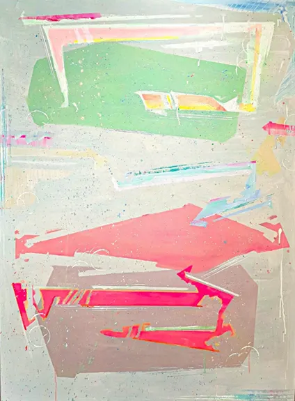 파스텔 그린과 로즈 톤이 차분한 층위를 만들고, 한 줄의 형광색이 방향을 틀며 긴장을 일으킵니다. 둥글게 남은 흔적과 미세한 스크래치가 시간의 궤적을 드러내며, 서로 다른 결이 같은 중심을 찾아가는 순간을 보여줍니다. 안정과 긴장이 한 호흡 안에서 균형을 이룹니다.