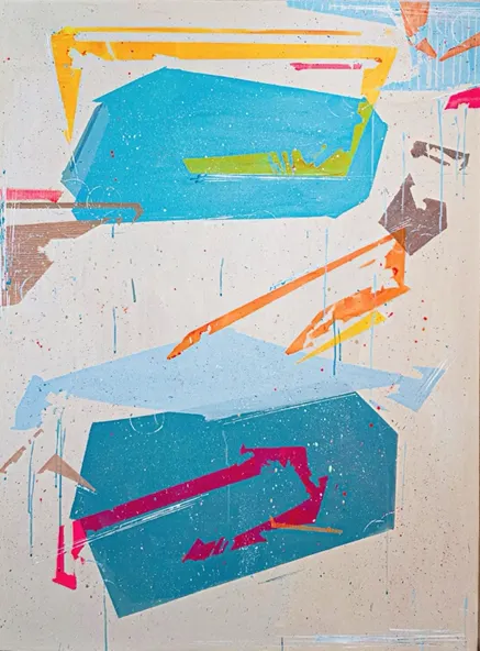 깊은 블루의 큰 면적이 화면을 지탱하고, 오렌지와 마젠타의 흐름이 그 위를 가로지르며 구조적 울림을 만듭니다. 차분히 쌓인 층과 날카롭게 가르는 색의 선이 공존하며, 면적과 색감의 힘이 빛의 질서를 세워 갑니다. 파편이 구조로 변하는 순간의 응축을 포착했습니다.