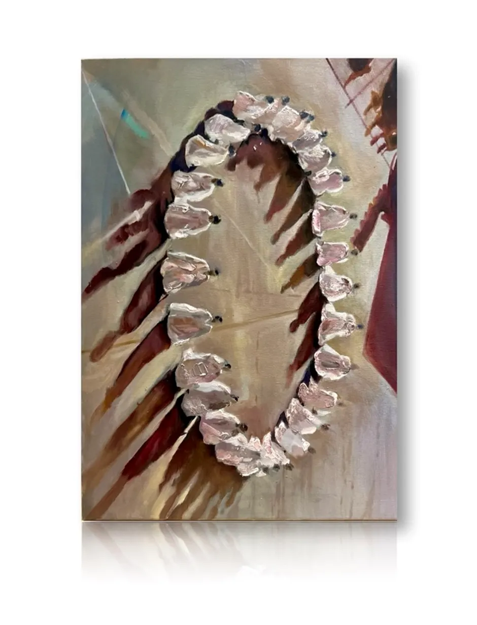 케이크의 단면, 푸른빛으로 전환된 생크림, 뒤집힌 인물 초상 등 서로 다른 오브제가 층위를 이루듯 중첩되며, 어떤 장면은 희미하게 남고 또 다른 장면은 최종 붓질만이 강하게 드러난다.이러한 시각적 지층은 관람자에게 끊임없는 불확실성을 제공하며, ‘본다’는 행위 자체를 의심하게 만든다. 단순한 시각적 혼란이 아니라, 이미지가 과잉 소비되는 시대 속에서 시선이 점차 가벼워지고 진실을 잃어가는 현상을 은유하는 것이다. 은폐와 드러남, 명료함과 모호함, 재현과 해체의 경계에서 이 작품은 관람자가 자신의 시선을 되돌아보게 만든다.