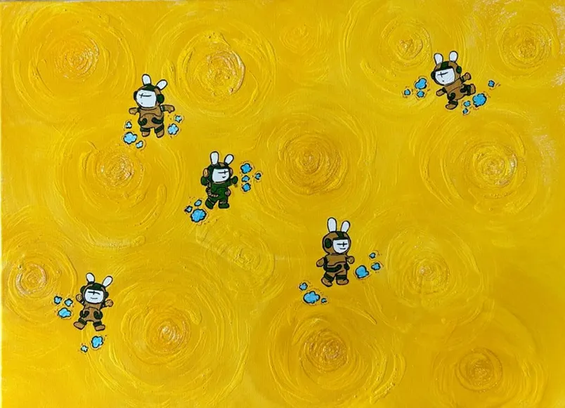 노란색의 해바라기 빛 배경은 따스함과 생명력, 그리고 관람자 내면의 빛을 상징한다. 반 복되는 원형의 흐름은 우주의 끝없는 순환과 내면의 에너지를 표현하며, 그 위에 놓인 백토끼와 파란색의 작은 파편들은 꿈과 희망을 향해 나아가는 움직임의 흔적이다. 작품은 관람자에게 강렬한 자기 확신을 요구하지 않는다.