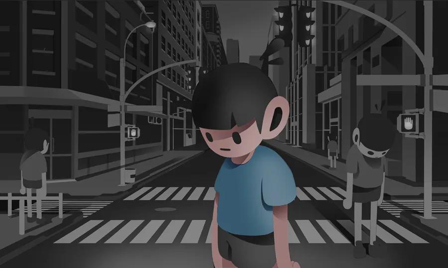 주변 인물들은 작고 배경처럼 존재 이는 주변 사람들과의 단절, 무관심, 소외를 표현