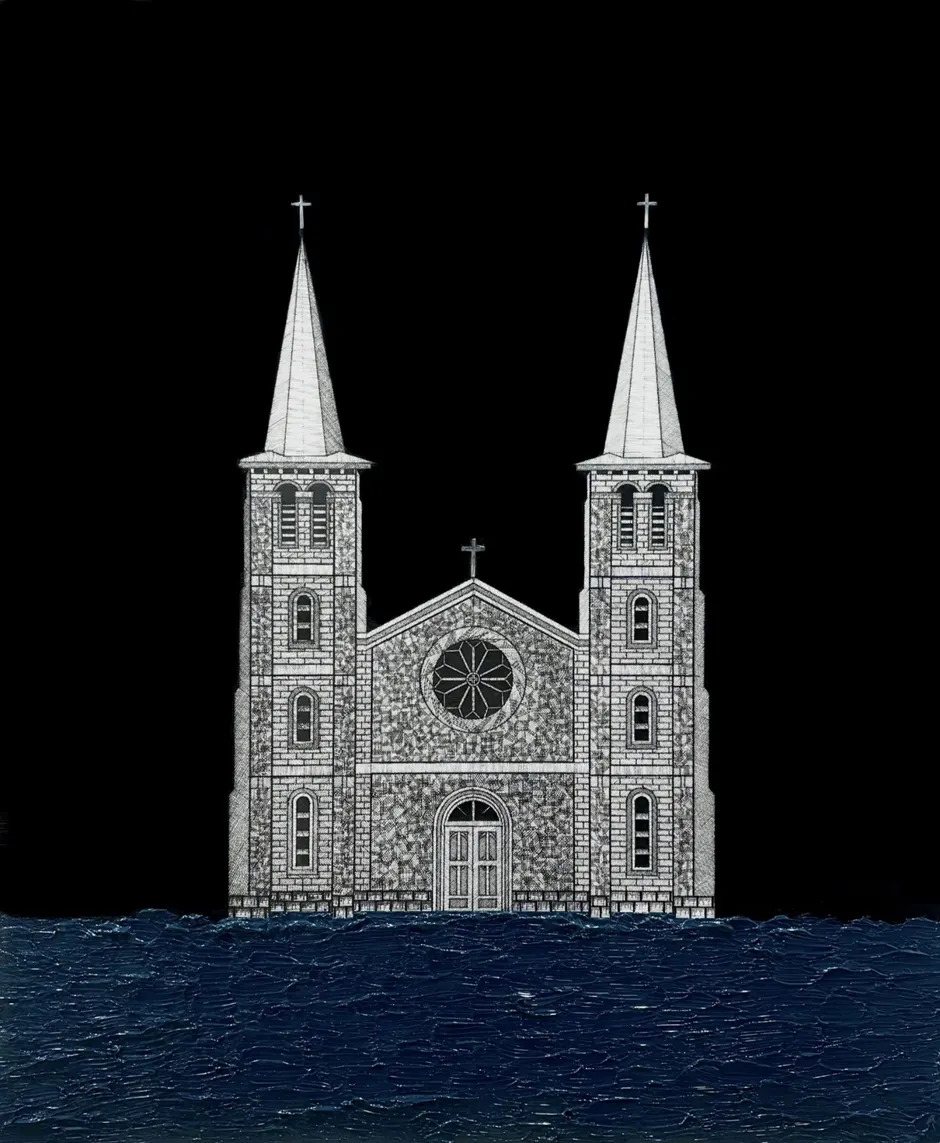 강수현 / 환각5 – Gyesan Catholic Church / oil, pen, cross pendant on canvas / 농협 3023264080941 강수현 / 72.7 x 60.6 / 2025 / 1,500,000.