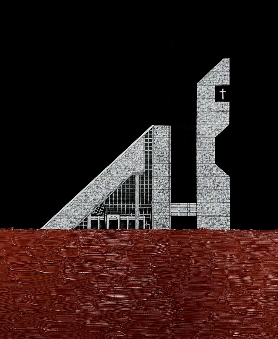 강수현 / 환각6 – Nam Chen Roman Catholic Cathedral / oil, pen, cross pendant on canvas / 농협 3023264080941 강수현 / 72.7 x 60.6 / 2025 / 1,500,000.