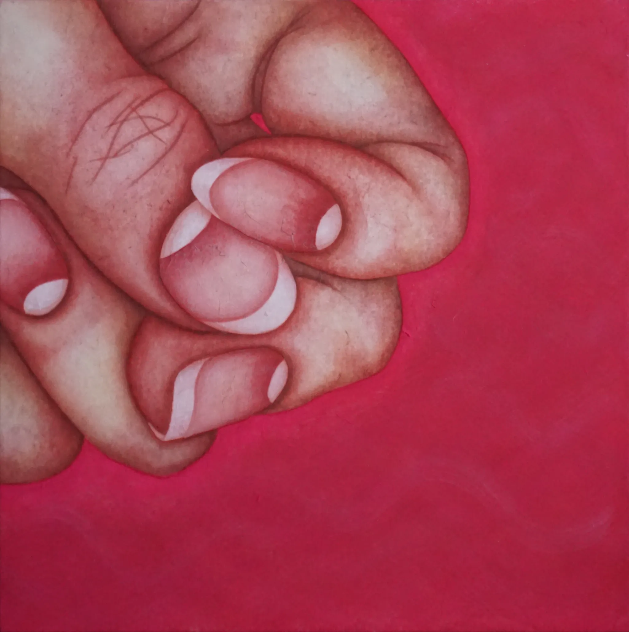 시각적 분석에 있어, 저는 신체의 일부인 손을 극단적으로 확대하여 클로즈업했습니다. 이 행위는 충동적인 공격성이 외부로 표출되는 것을 결사적으로 억제하고 있는 행위이자, 통제력을 유지하기 위한 자학적 자극의 결과물입니다. 분채의 미세하고 섬세한 채색 기법을 활용하여 피부 색조를 붉게 달아오른 듯이 표현하고 손가락의 주름을 과장했습니다. 이는 불안하고 초조한 심리적 압축 상태를 여실히 보여줍니다. 배경의 강렬한 핑크 색조는 귀여움을 상징하는 동시에, 억제된 충동이 터져 나오기 직전의 격렬한 에너지를 암시하며 작품의 시각적, 심리적 긴장감을 극대화합니다.