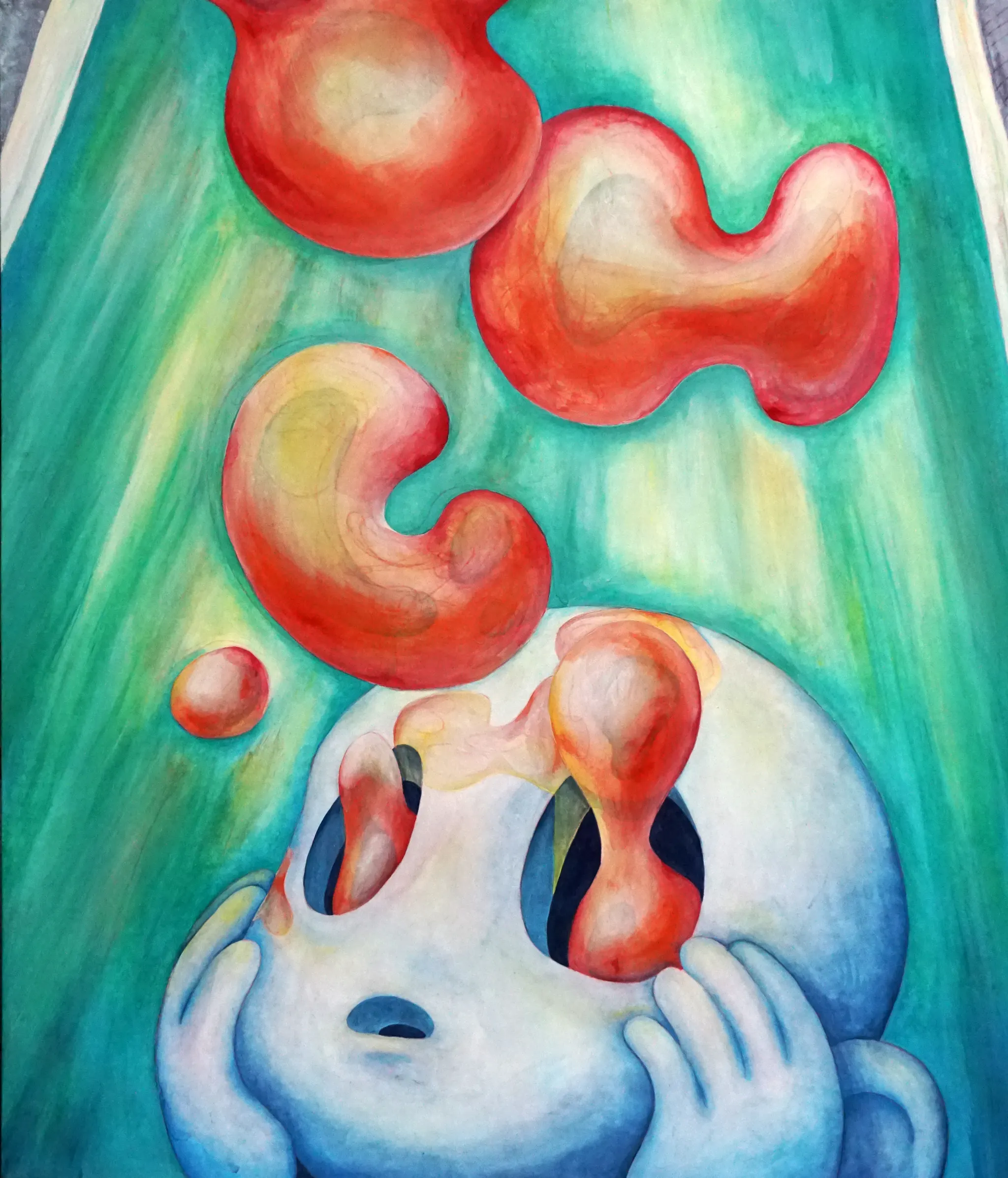 시각적으로 저는 장지와 분채라는 한국화의 전통 재료를 선택하여 이 복잡한 감정의 흐름을 표현했습니다. 저에게 영감의 근원이었던 용암 램프의 유기적이고 미묘하게 슬픈 형태는 화면 위에서 감정이 녹아 뒤섞인 듯한 붉은 덩어리로 변용되었습니다. 이는 뜨거운 열정과 상실감이 교차하는 지점을 상징합니다. 특히, 분채라는 고운 안료의 특성을 활용하여 얼굴의 순수한 백색과 배경의 깊은 초록색을 대비시켰습니다. 채색의 질감을 통해 감정이 뭉쳐지고 물처럼 유동적인 시각적인 효과를 극대화했으며, 이는 내면의 고백을 조형적으로 기록하는 저만의 방식입니다.