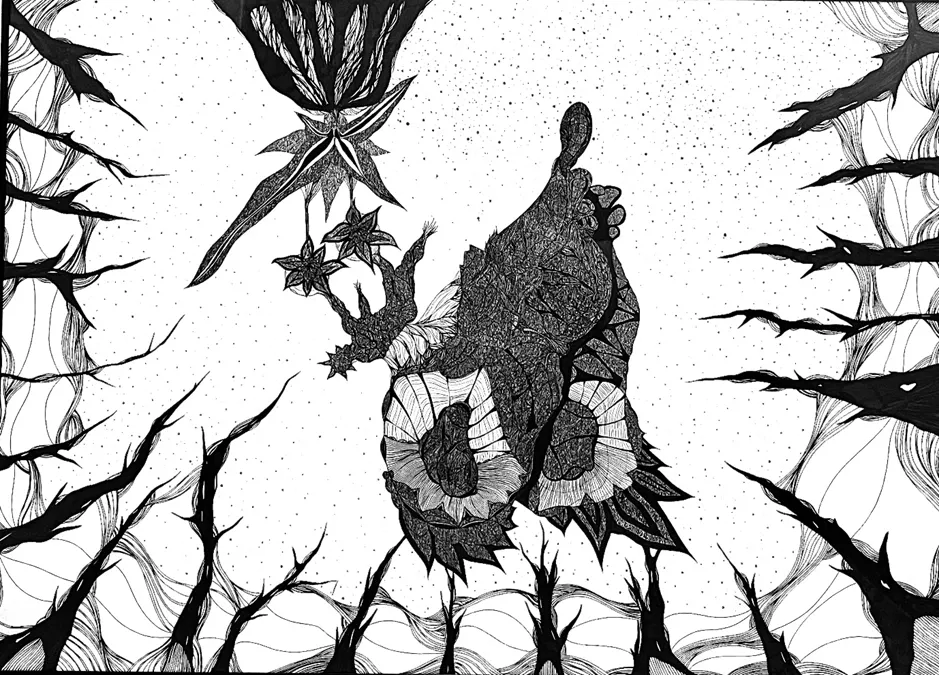 이 작품은 마태복음 27장 50~52절 말씀을 시각화한 드로잉으로, 예수 그리스도의 죽음이 단지 끝이 아니라 새로운 생명의 시작이었음을 표현하고 있습니다. “내가 선택한 끝은 너를 위한 시작이다”라는 메시지를 중심으로, 예수님의 십자가 위 죽음을 통해 열렸던 새로운 삶과 부활의 소망을 상징적으로 풀어냈습니다. 작품 속 꽃들은 모두 사람의 형상을 닮아 있으며, 죽음 가운데 뿌리를 내리고 그 속에서 피어나고 있습니다. 위쪽으로는 찢긴 듯한 형상의 꽃잎과 몸을 흩뿌리는 존재들이 있으며, 아래쪽에서는 손을 뻗으며 꽃처럼 피어나는 존재들이 보입니다. 이는 예수님의 죽음이 자신 하나의 생명을 소진시킨 비극이 아니라, 오히려 수많은 이들에게 생명을 피워내는 근원이 되었음을 상징합니다. 예수는 혼자서도 온 세상을 밝힐 수 있는 존재였지만, 스스로 무너짐으로써 가장 어두운 심연 속에 있는 이들에게 생명을 나누셨습니다. “꽃이 꽃가루를 날려 새로운 생명을 살리듯, 아무것도 피어나지 않을 것 같던 우리에게 아름다운 꽃을 피우셨다”는 메시지가, 이 작품의 핵심적인 형상과 깊이 연결되어 있습니다. 검은 선과 점으로 가득 찬 밀도 높은 드로잉은 죽음의 무게와 동시에 생명의 싹틈을 함께 보여줍니다. 이는 죽음을 통해 드러난 하나님의 사랑과, 그 사랑을 받아 피어나는 우리 존재의 존귀함을 드러내는 시각적 찬가입니다.
