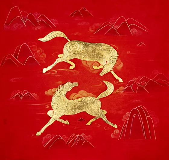 배경의 산수는 현실 세계를,그 위를 날아오르는 금빛 말은 영혼의 차원에서 일어나는 인식의 변화를 상징합니다.그 만남은 사랑일 수도 있고,서로를 통해 자신을 비추어보는 깨달음일 수도 있습니다.
