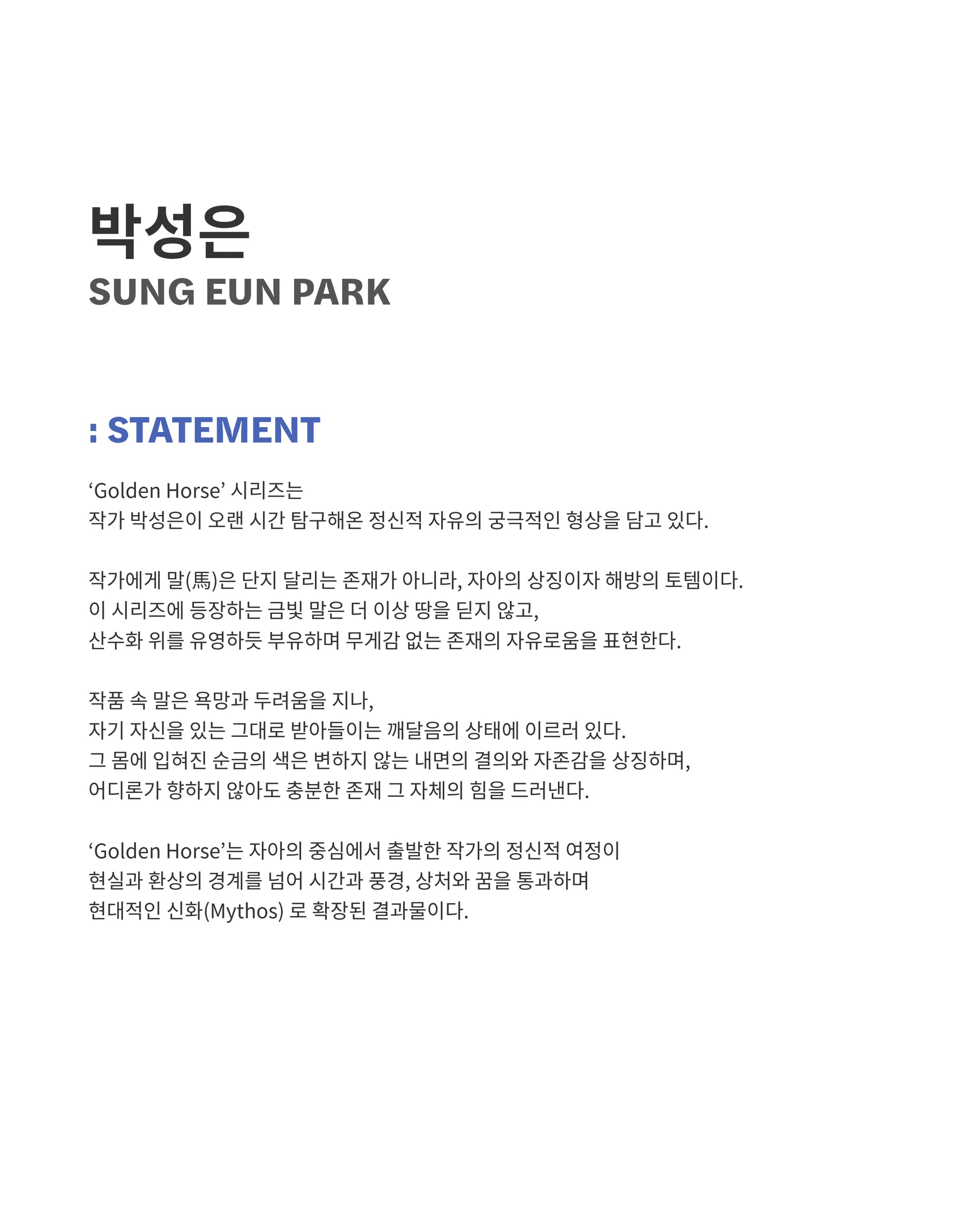 ‘Golden Dream’은 나의 정신적 자유를 향한 여정을 상징하는 작품입니다.나는 오래전부터 ‘꿈은 영혼의 생명’이라고 믿어왔습니다. 꿈은 단순한 환상이 아니라,존재를 움직이게 하는 근원적인 에너지이며, 인간이 스스로의 한계를 넘어서는 내적 힘입니다.