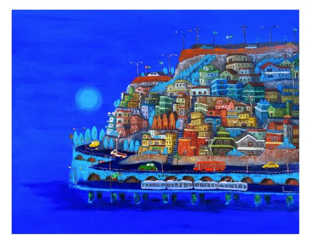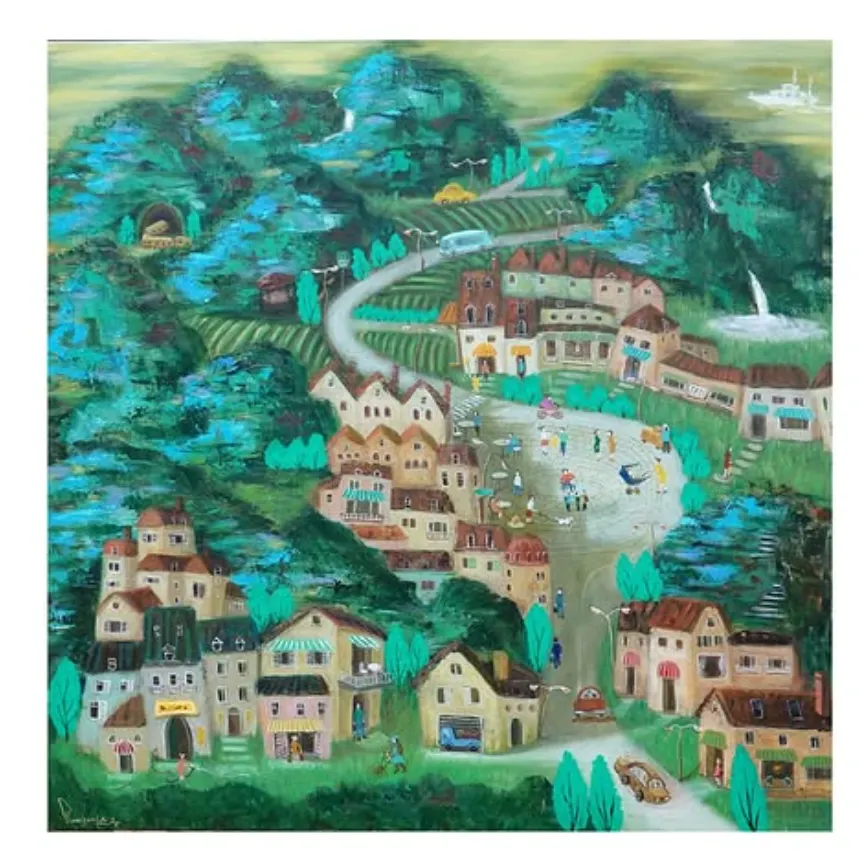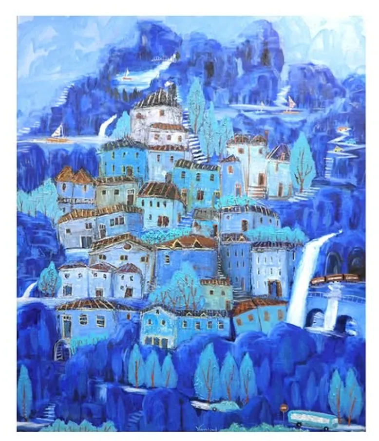 윤종의 〈한강연가〉는 깊고 푸른 화면 위에 다채로운 건물과 교통수단이 겹겹이 자리하며, 도시와 강이 뒤섞인 풍경을 하나의 서정적 장면으로 끌어들인다. ‘연가’라는 제목처럼, 작업은 한강이라는 공간에 특정한 삶의 정서와 추억을 담은 노래의 대상으로 바라보게 하는데, 도시의 활기와 자연의 정적이 교차하는 이 장면 속에서 관람자는 집합된 기억의 풍경을 마주하며, 자신만의 서사를 덧붙일 수 있게 한다.