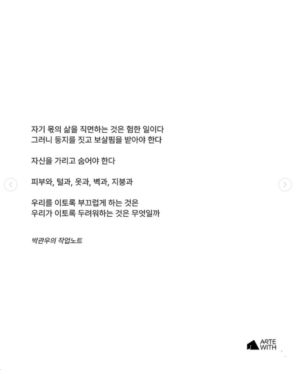 시와 같은 박관우의 노트를 읽고는 귀가 올라가는 느낌이 들었다. 배우의 섬뜩한 연기나 오케스트라가 절정을 구현할 때 프리송(frisson)을 경험하는 것처럼 말이다. 존재하는 일이, 그러니까 말하고 입고 먹는 일이 이렇게도 숨 막히는 일이었던가. 작가의 언어는 알아볼 수 없는 조형을 통해 침묵의 나선을 그리며, 나를 정의하던 모든 발현에 모든 질문을 던지는 듯하다. 작가는 그러니까 나약한 당신이여, 뭐가 그렇게 부끄러워 그렇게 말하고 입고 먹으며 부둥키며 살아가고 있는가라고 묻는다.