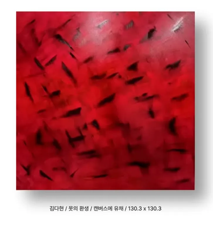 작가는 강렬한 진홍을 선택하였다. 원색으로 폭발하는 듯한 정방형 캔버스는 그 덕에 수치의 크기를 망각한 채 진동한다. 마치 형체를 알 수 없는 어떤 생물에게 가까이 다가갈 때, 이것이 무엇인지 알 수 없어 떨리나 그 실체를 밝히는 것은 참을 수 없는 긴장감 같은 것이 화면 전체에 이글거리며 기묘한 감상을 유발한다.