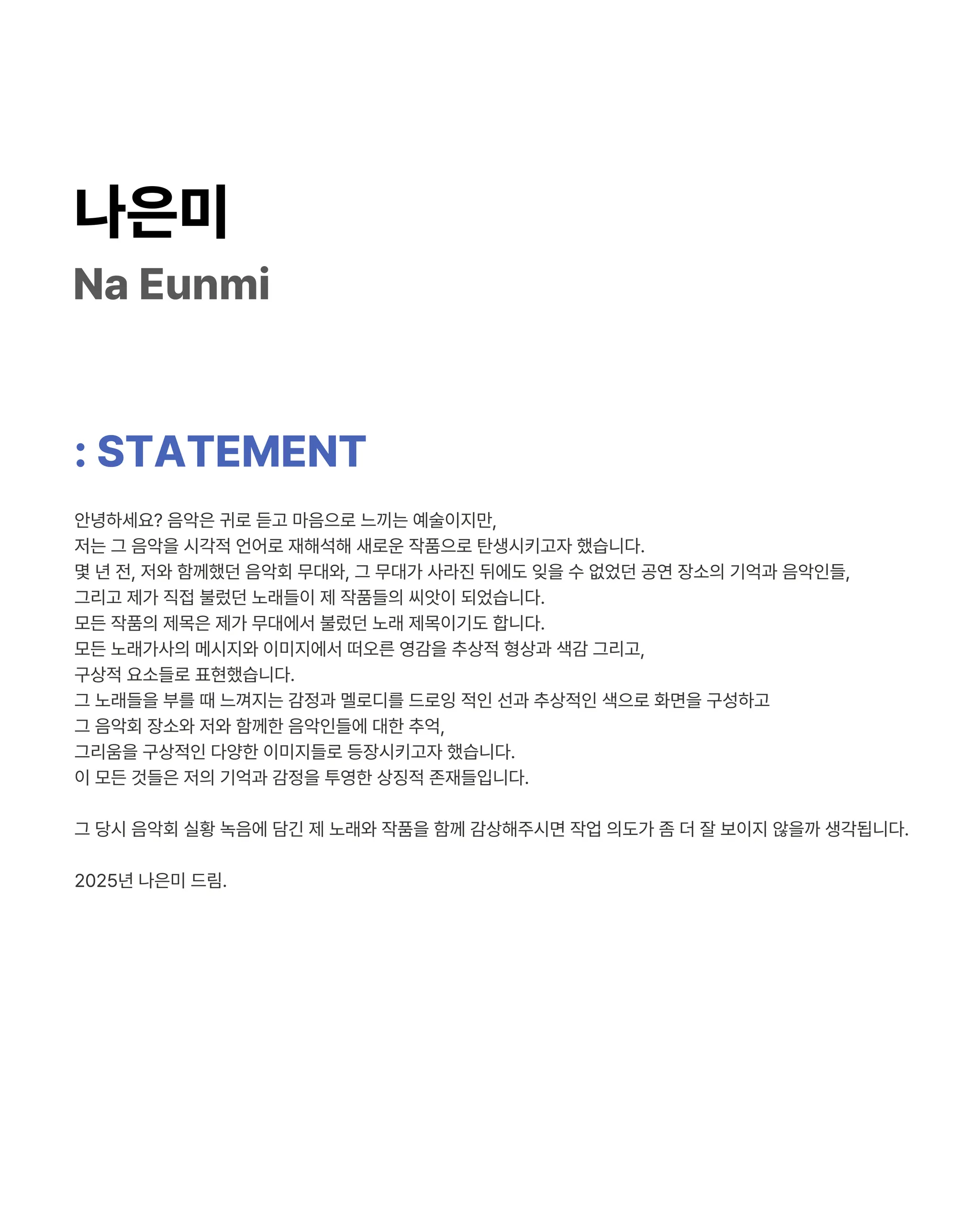 이 작품은 오래전 혼성 그룹 ABBA의 명곡이자 뮤지컬 맘마미아의 ‘Thank You for the Music’에서 영감을 받아 완성되었다. 이 곡은 내가 음악에 대해 품고 있는 생각과 감정을 가장 잘 표현해주는 노래이기도 하다.