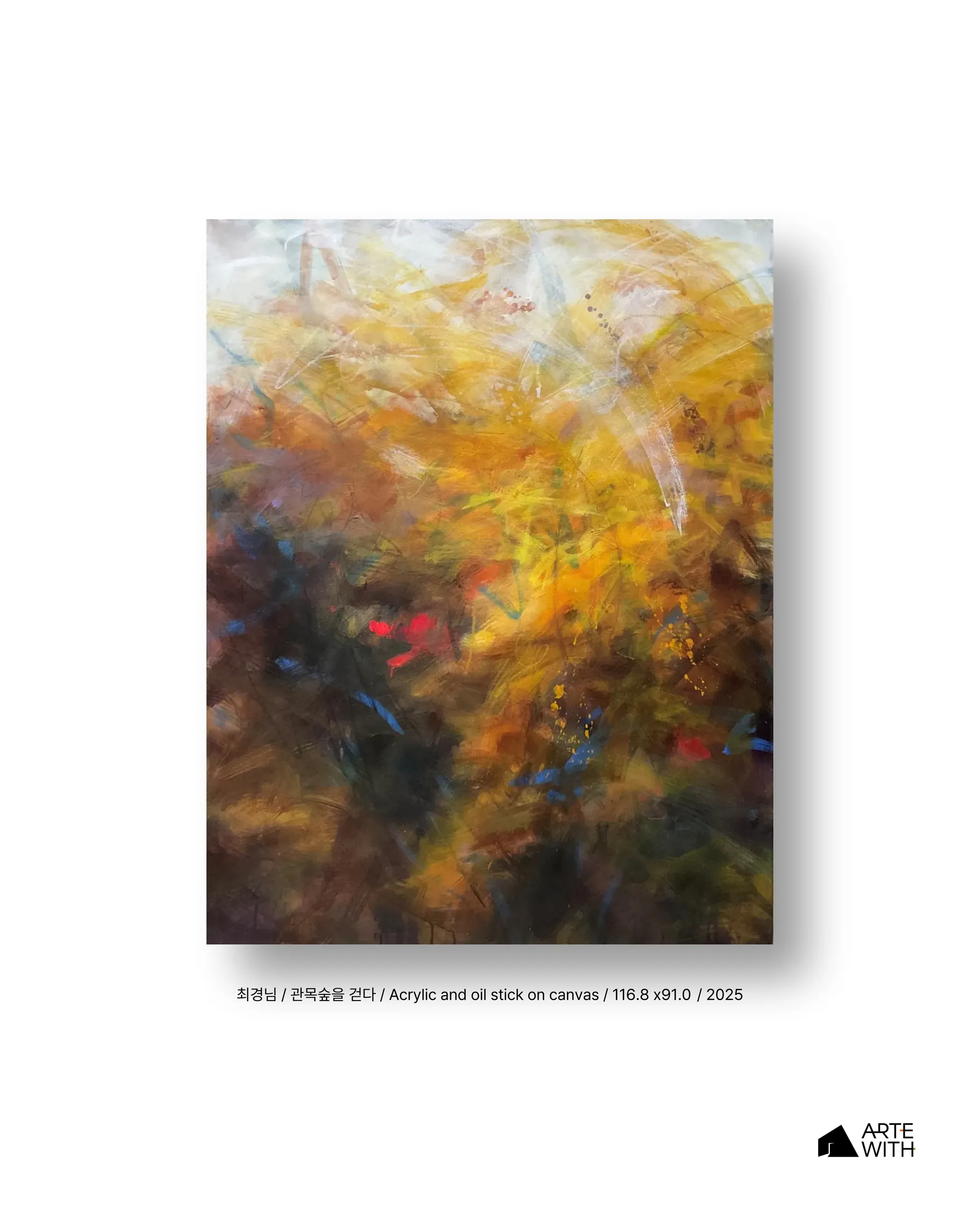 원화를 마주하면 가장 먼저, 화면 전역에 흩어져 밀도 있게 박힌 색의 덩어리들과 제스처들이 스스로의 질서를 거부하며 외곽으로 번져 나가는 운동성이 감지된다. 이는 추상의 언어를 선택한 듯 보이지만, 감상자의 정서를 자극하는 차원을 넘어, 자연이 품은 비집중적 에너지—즉 퍼져 나가며 자신을 증식시키는 생명적 움직임—를 회화의 구조로 번역하려는 시도라고 볼 수 있겠다.