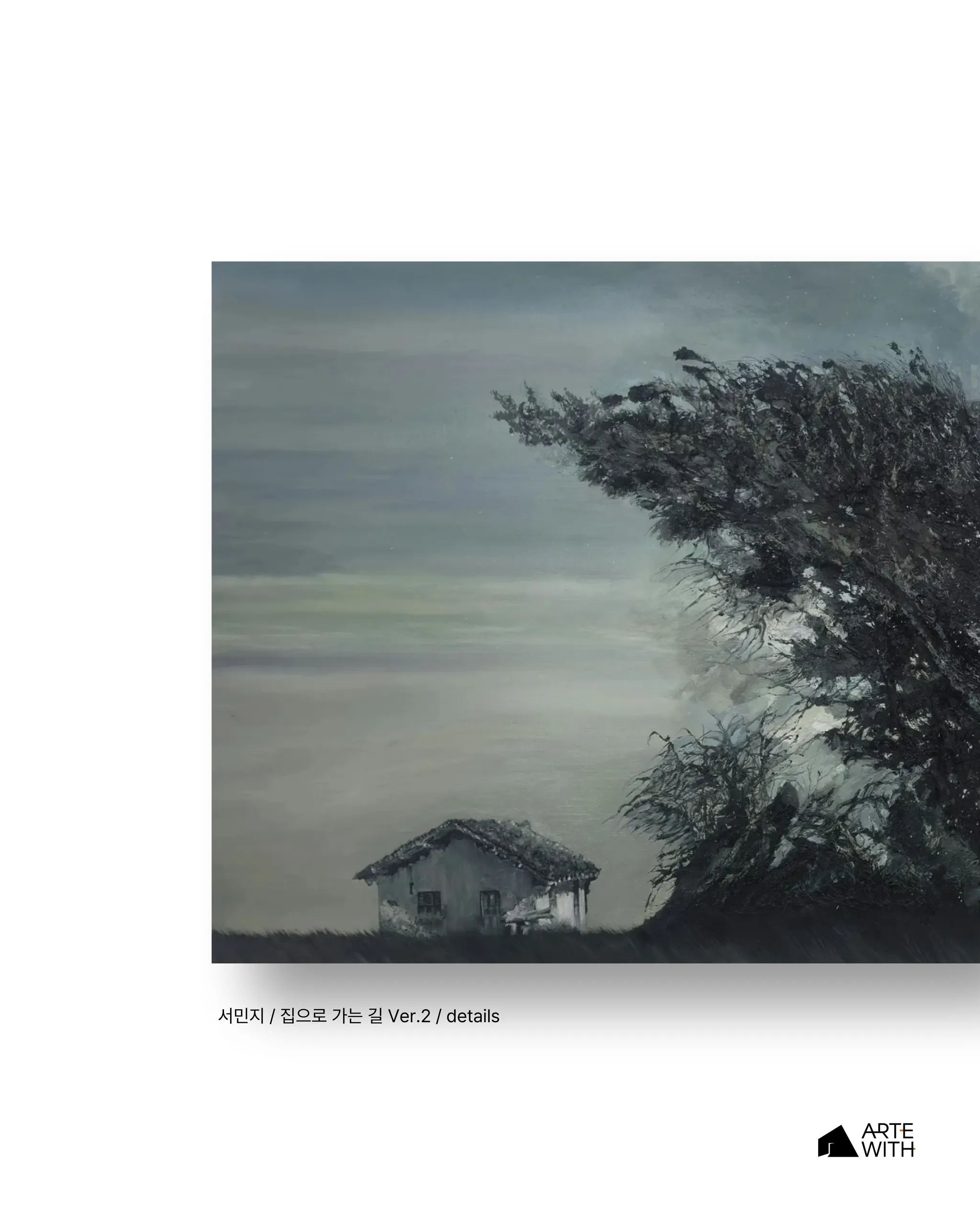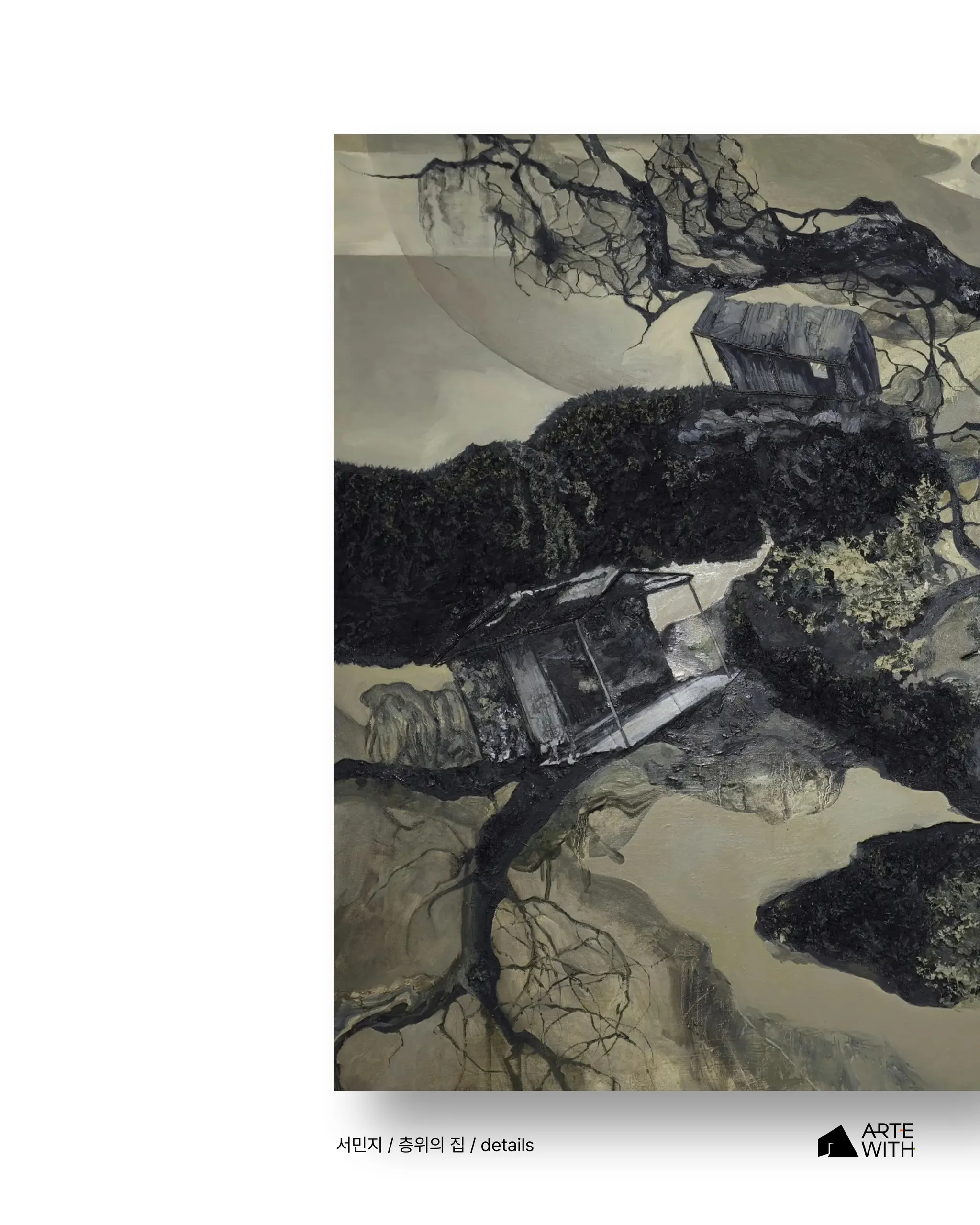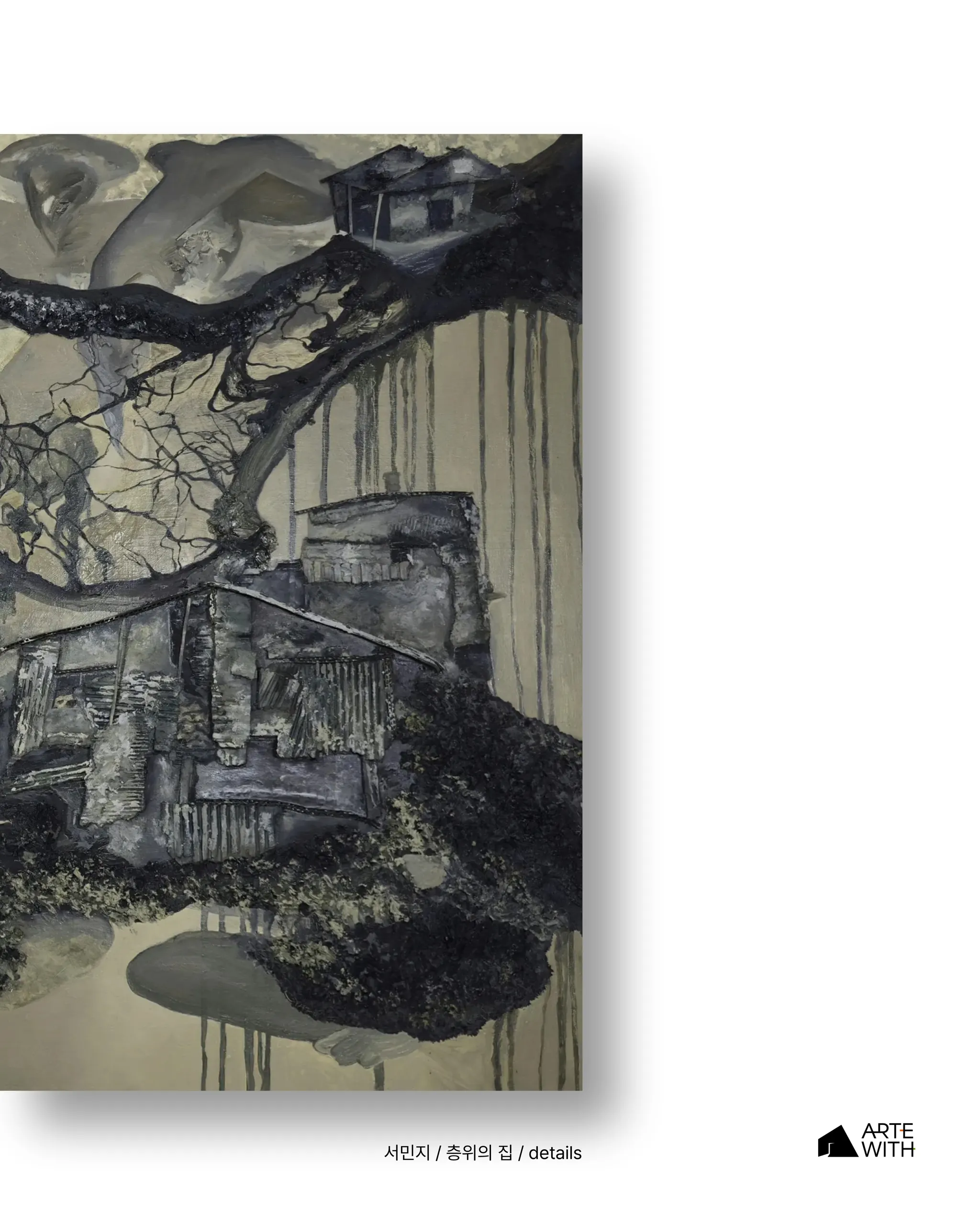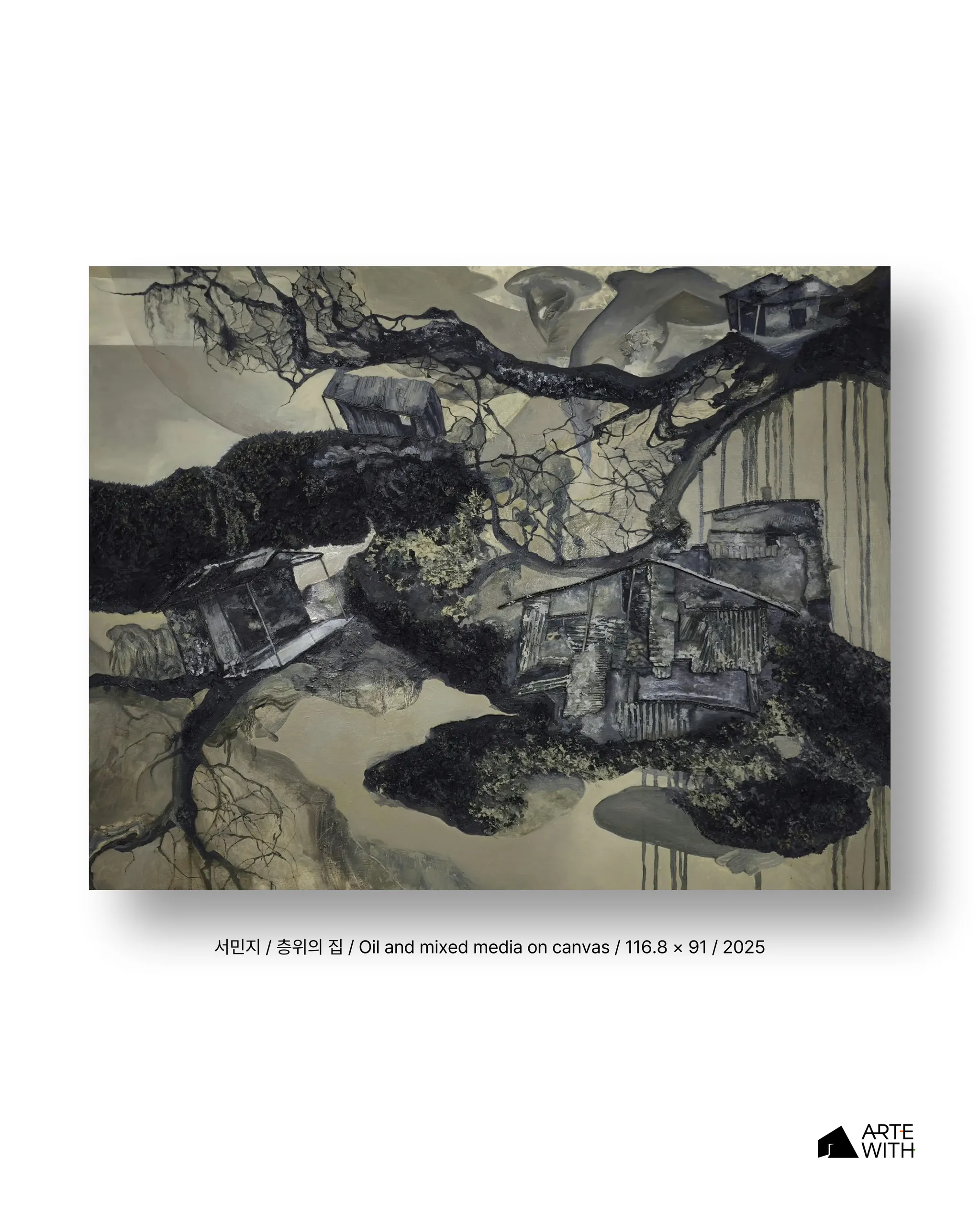 회화는 집에서 출발한다. 집은 파도처럼 쏟아질 듯한 녹읍 아래에 놓이기도 하고, 알 수 없이 작동하는 중력 속에서 이리저리 부유하다가 나무의 가지에 매달린 모습으로 등장하기도 한다. 회화의 맥락 속에서 집은 더 이상 안정된 정주(定住)의 장소가 아니다. 그것은 끊임없이 흔들리고 재배치되는 상태로서 화면 위에 놓여 정서적 이질감으로부터 사유를 촉발한다.