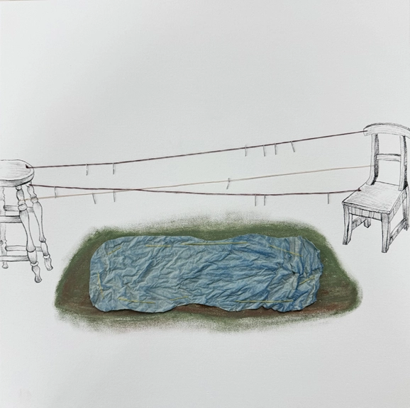 장유빈 / 대화 중 / 캔버스에 오일파스텔, 펜, 광목천, 실, 스테이플러 / 45x45 / 2025 / 300,000원