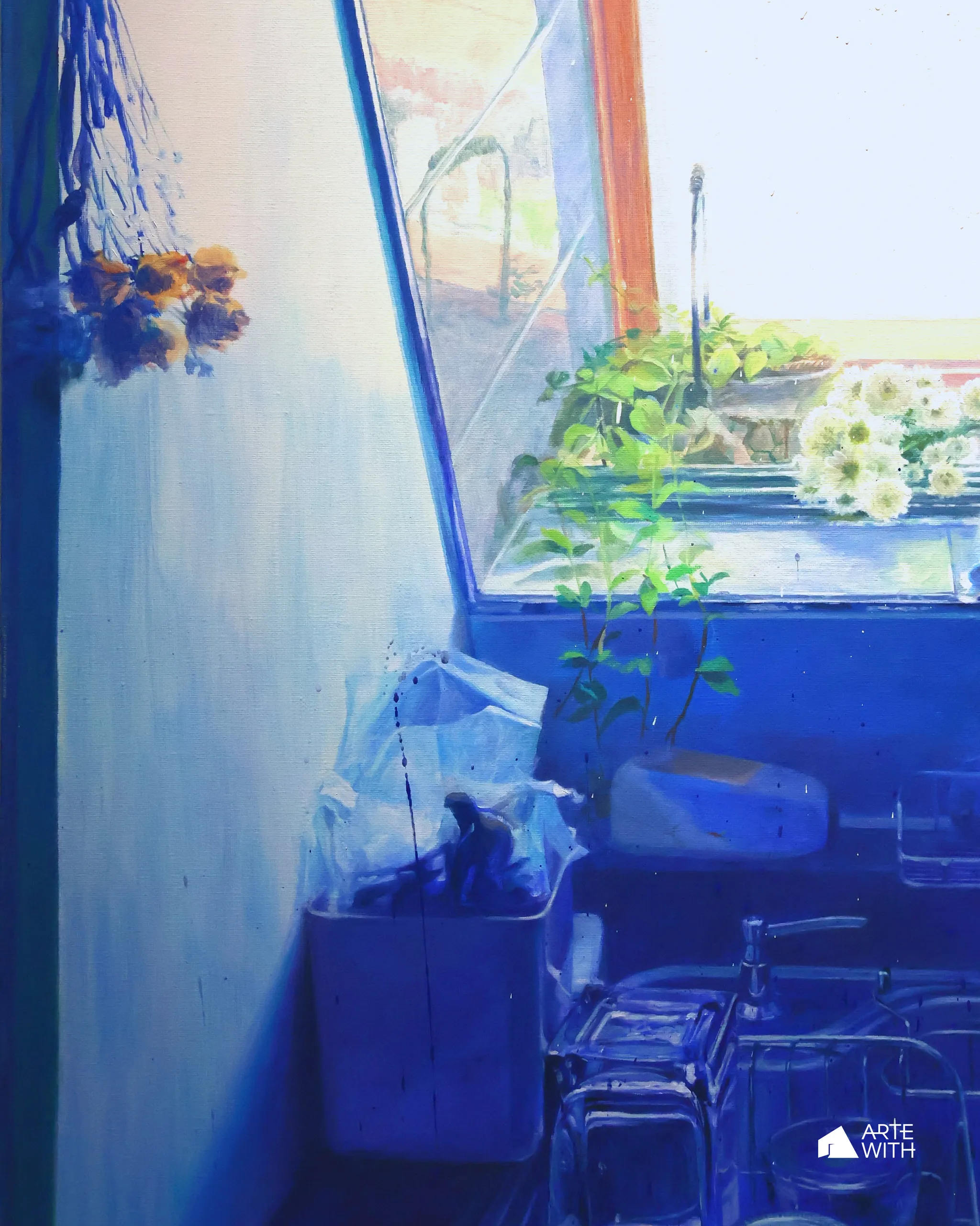 따라서 회화에서 상실과 발견은 분리되지 않는다. 놓쳤다는 인식과 비로소 보게 되었다는 감각은 동시에 발생하며 하나의 경험으로 겹쳐진다. 설거지는 아직 끝나지 않았고, 물기는 계속 마르고 있으며, 장면은 완결되지 않는다. 화면은 과거를 회상하지도 미래를 예고하지도 않는다. 오직 지금-여기에서 지속 중인 상태로 머문다. 관람자는 이해하거나 해석하기보다, 무엇을 보지 않고 지나쳐왔는지를 알아차리는 자리에 놓이게 되지 않을까.