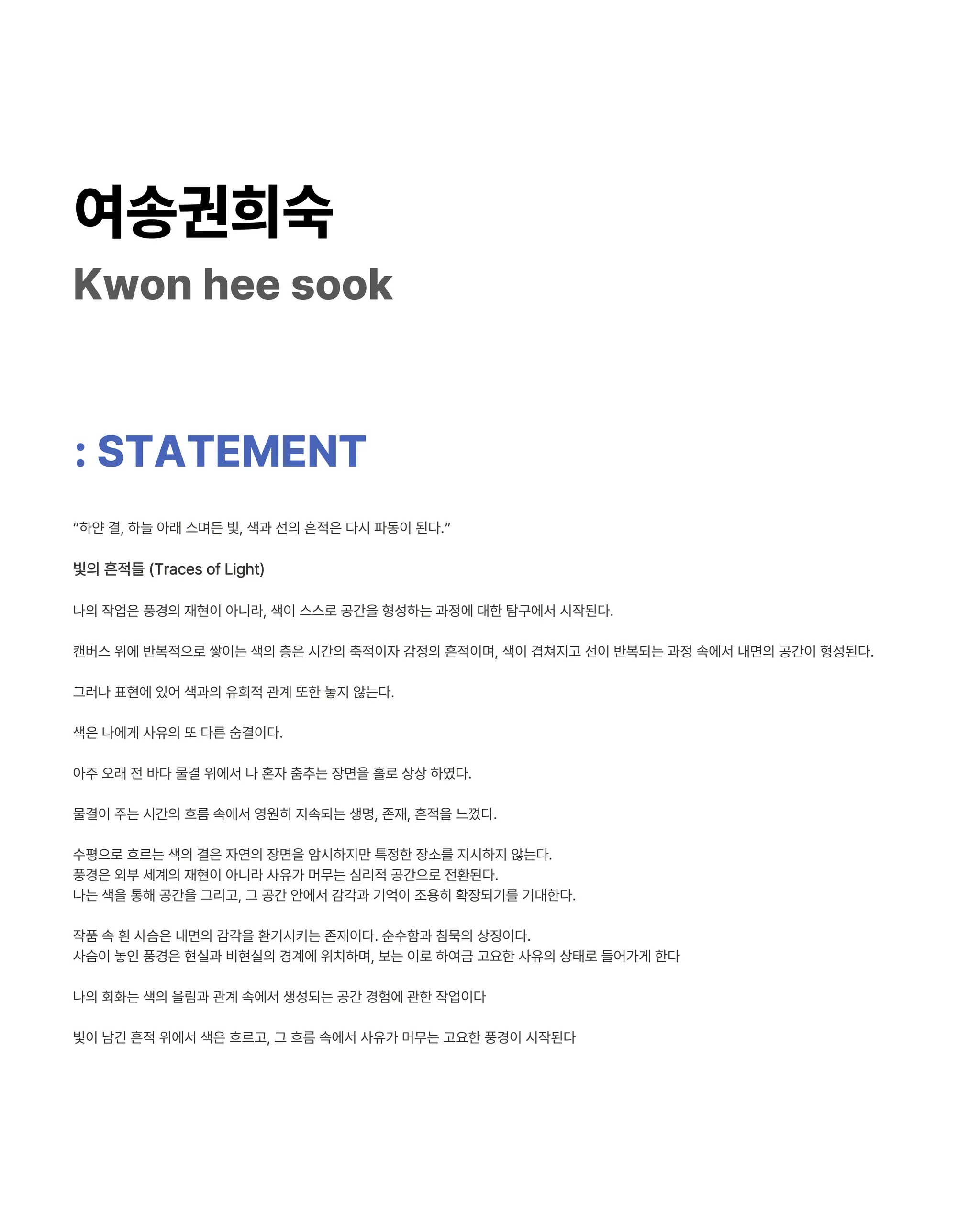 “빛의 결은 홍시처럼 붉고, 물결과 금빛 숨결은 흔적의 공간에 스며든다.”