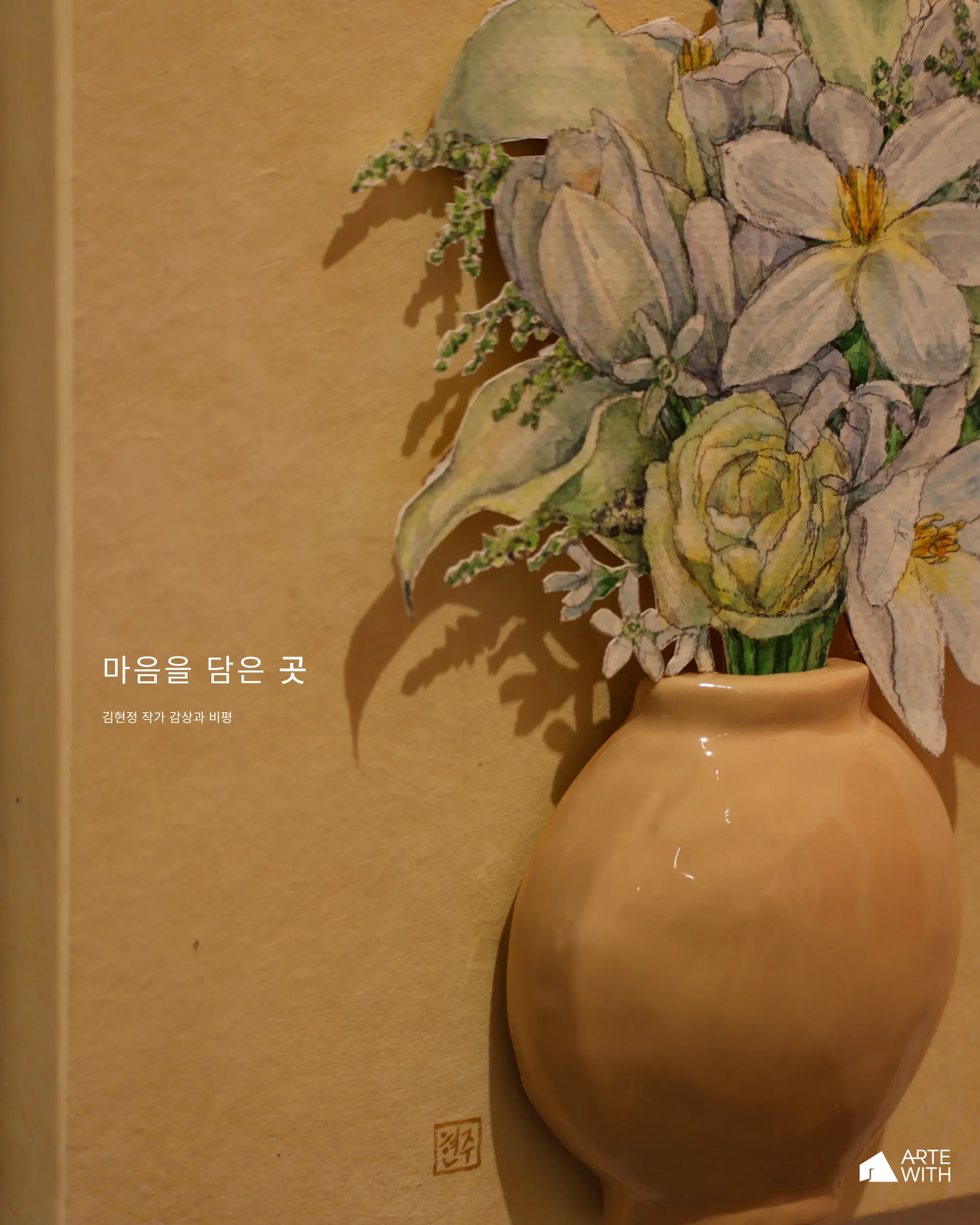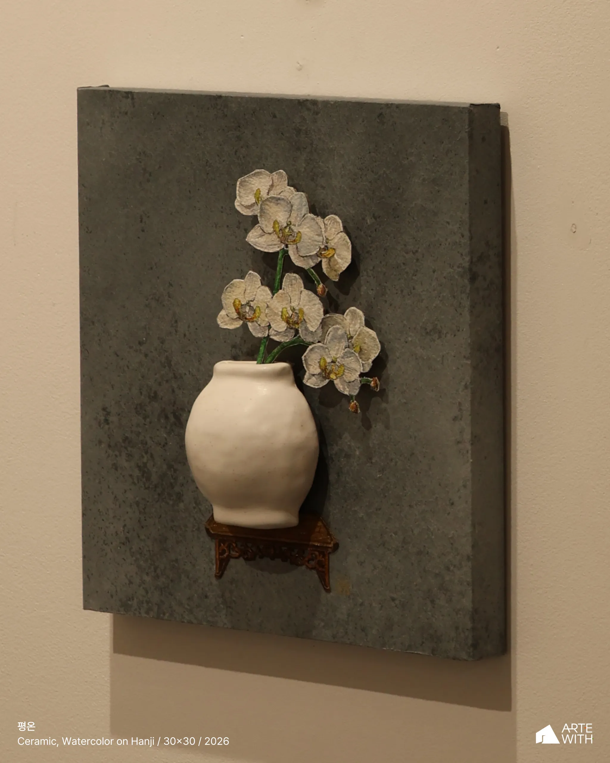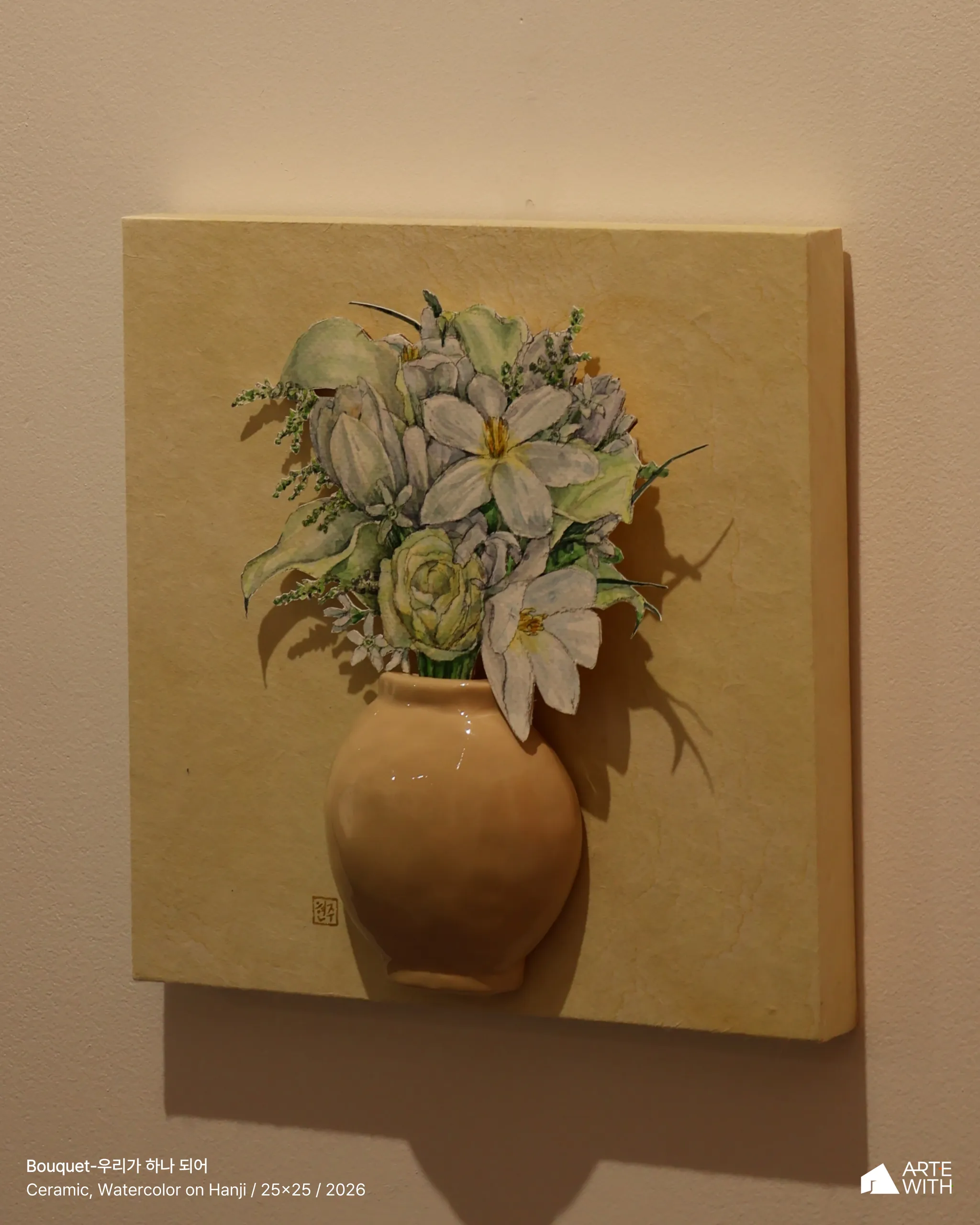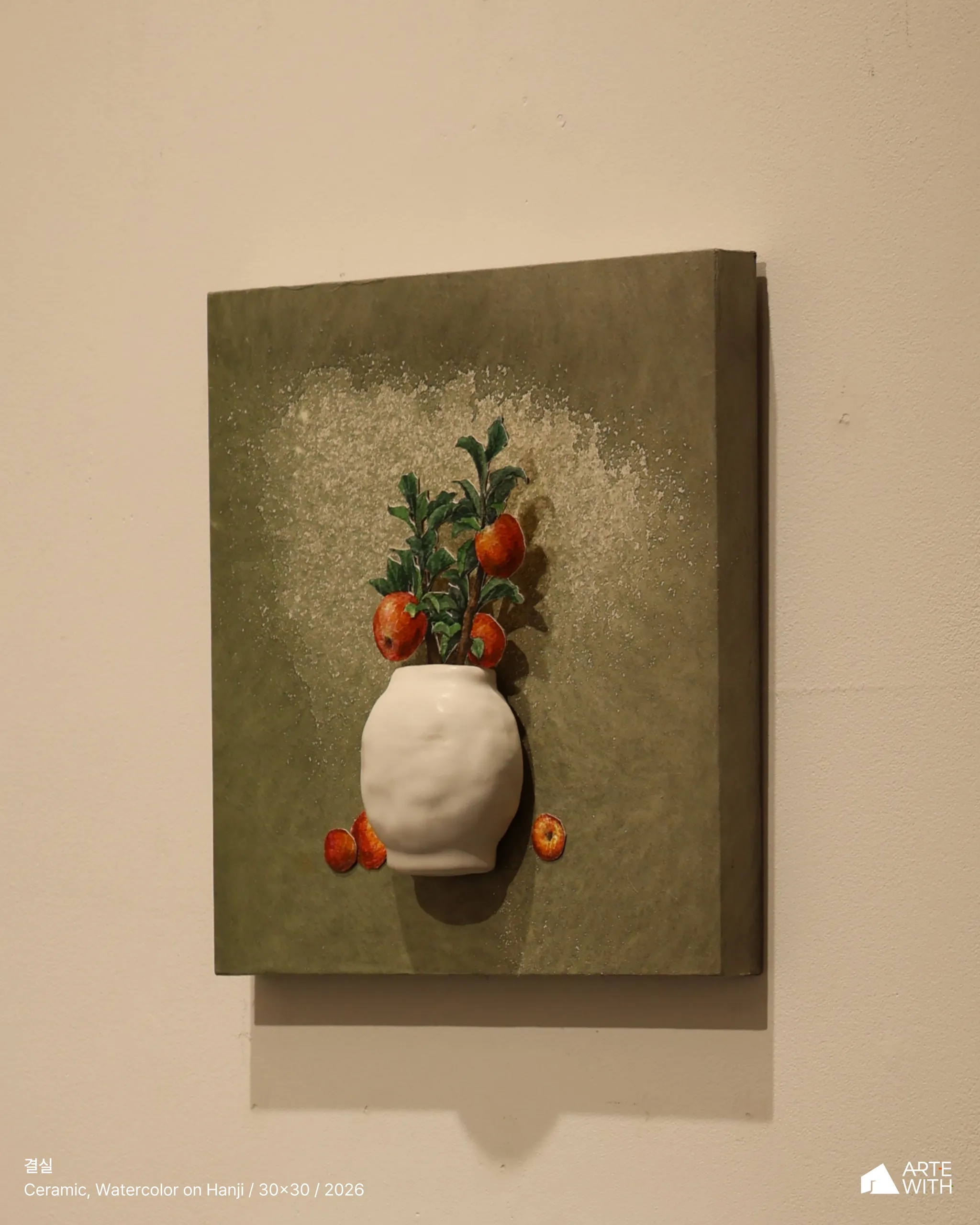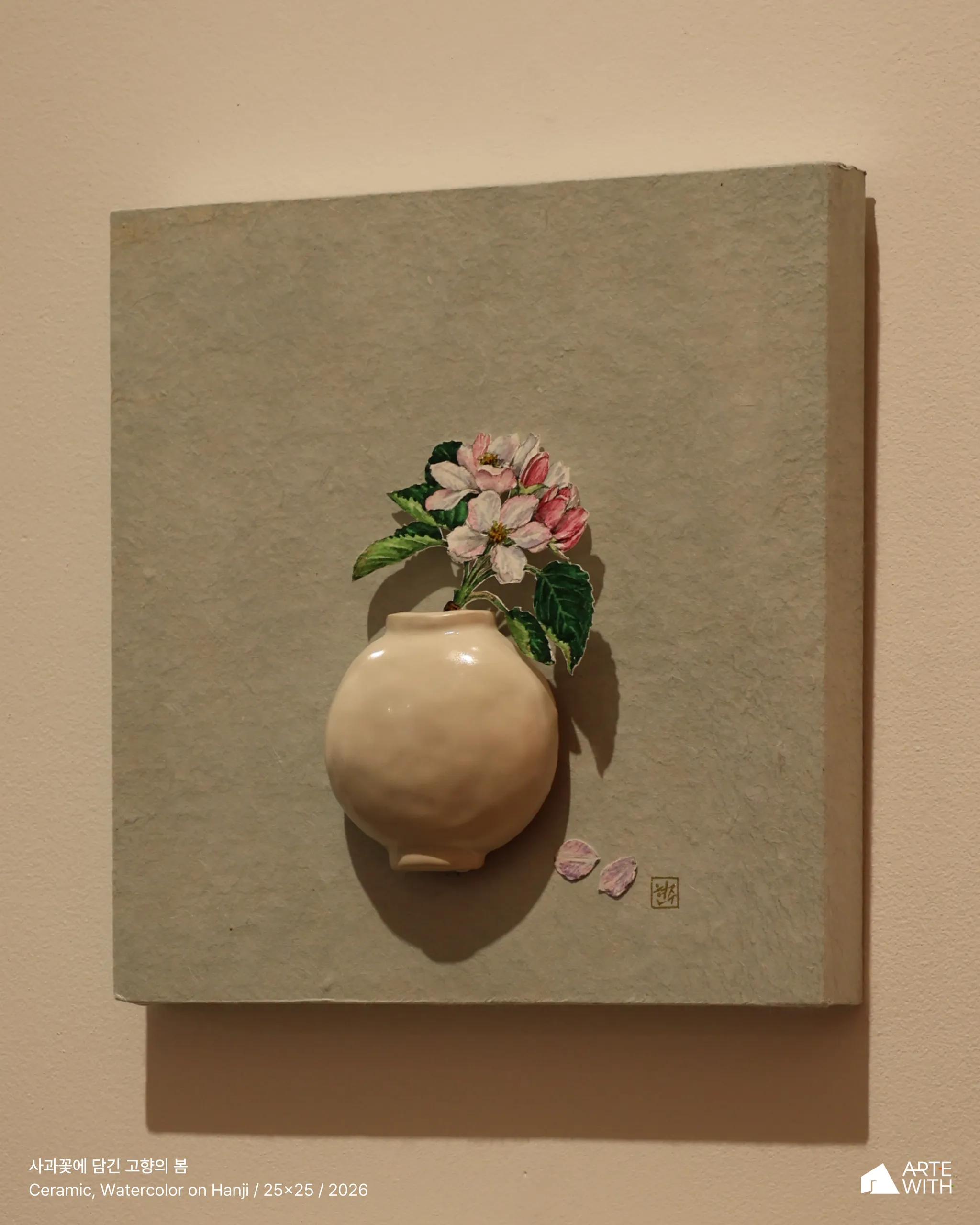 작업은 다소 엄준한 분위기를 풍기는 달항아리들 사이에서 순박한 매력으로 눈길을 사로잡는다. 오브제로서의 수채 활용은 화면의 화룡점정이 되는데, 작가만의 감도가 효과적으로 강조되어 감상의 발길을 작업 가까이 이끌고 오래 머물게 한다.