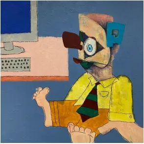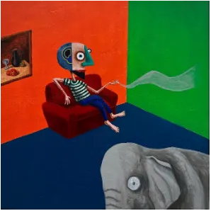 나의 작업은 학습과 가식으로 꾸며진 내가 아닌 무의식과 가까운 상태인 온전한 나를 찾기 위함으로 시작되며, 모든 작품에는 나를 대변하는 인물 · 공간 · 사물 등이 등장한다. 타인의 시선에 벗어나 ‘나’를 공간에 가둔다. 오로지 나일 수 있는 익숙한 공간과 익숙한 사물들, 이성을 마비 시키고 술에 취한 듯 잠들기 직전과 같은 상태인 인물은 나를 투영한다. 의식하고, 정교하게 쌓아올려지는 것들은 진부하고 질려버린다. 오로지 감각에 의존하여 고민과 구상을 최소화 하고 낙서를 휘갈기듯 단시간에 본능과 습관 속에서 나오는 형상들을 이미지화 한다. 어디가 완성인지 모른다. 계획과 끝을 정해두지 않고 매 순간 순간 떠오르는 형태를 만들고 원하는 색을 올린다. 성에 차면 붓을 내려 놓고, 그렇게 나의 취향과 습관으로 쌓아올려진 작업은 ‘나'를 대변하는 모습이 아닌가 싶다. 나는 작품 속에서 일관된 나의 자아와 정체성을 표현하기 위해 작품 스타일을 구축했다. 나 자신이자 나의 작업의 코어를 잡기 위함이라고도 할 수 있다. 줄무늬 옷을 입히고 부은 듯 큰 이목구비는 일관되게 등장한다. 특이한 형태와 튀는 색채는 일차적으로 재미를 일으키고 멍 때리는 듯, 고뇌하는 듯한 인물의 시선은 무언가를 연상하게 한다. 작업의 코어를 지키는 동시에 발전&변화를 주어 다양한 이미지를 만들기 위해 노력한다.
