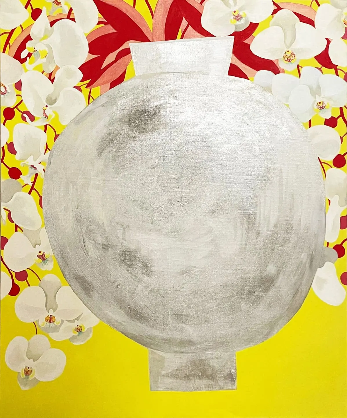 저는 치유를 위한 작품을 그리는 작가입니다. 저는 작품은 작가를 대변한다고 생각합니다. 저의 작품의 소재와 해석에 관한 부분에서 미술치료사이자 한국인인 저의 아이덴티티가 드러나게 됩니다. 서양화와 동양화, 입체와 평면의 그 어디쯤, 서양화를 그리는 한국인 혹은 한국인인 서양화가 처럼 말입니다. 달을 닮은 달 항아리에 꽃들은 항아리의 자태를 가리지 않고 모두 항아리의 배경처럼 자리잡게 됩니다. 제가 그리는 도자기는 사람 입니다. 두번의 소성을 통해 견고해지는 항아리가 사람의 인생과 무척 닮아 있다고 생각합니다. 인고의 시간을 견뎌내고 삶의 무게를 지고 살아가는 현대인들에게 응원과 영광을 담은 꽃들은 조연일뿐 항아리의 자태를 가리지 않은 이유가 되기도 합니다. 그림속의 호접난의 꽃말은 행복이 날아온다 입니다. 그림을 보는 분들의 삶에 따듯하고 에너지 넘치는 행복이 찾아오길 바라는 마음에서 제작하게 되었습니다.