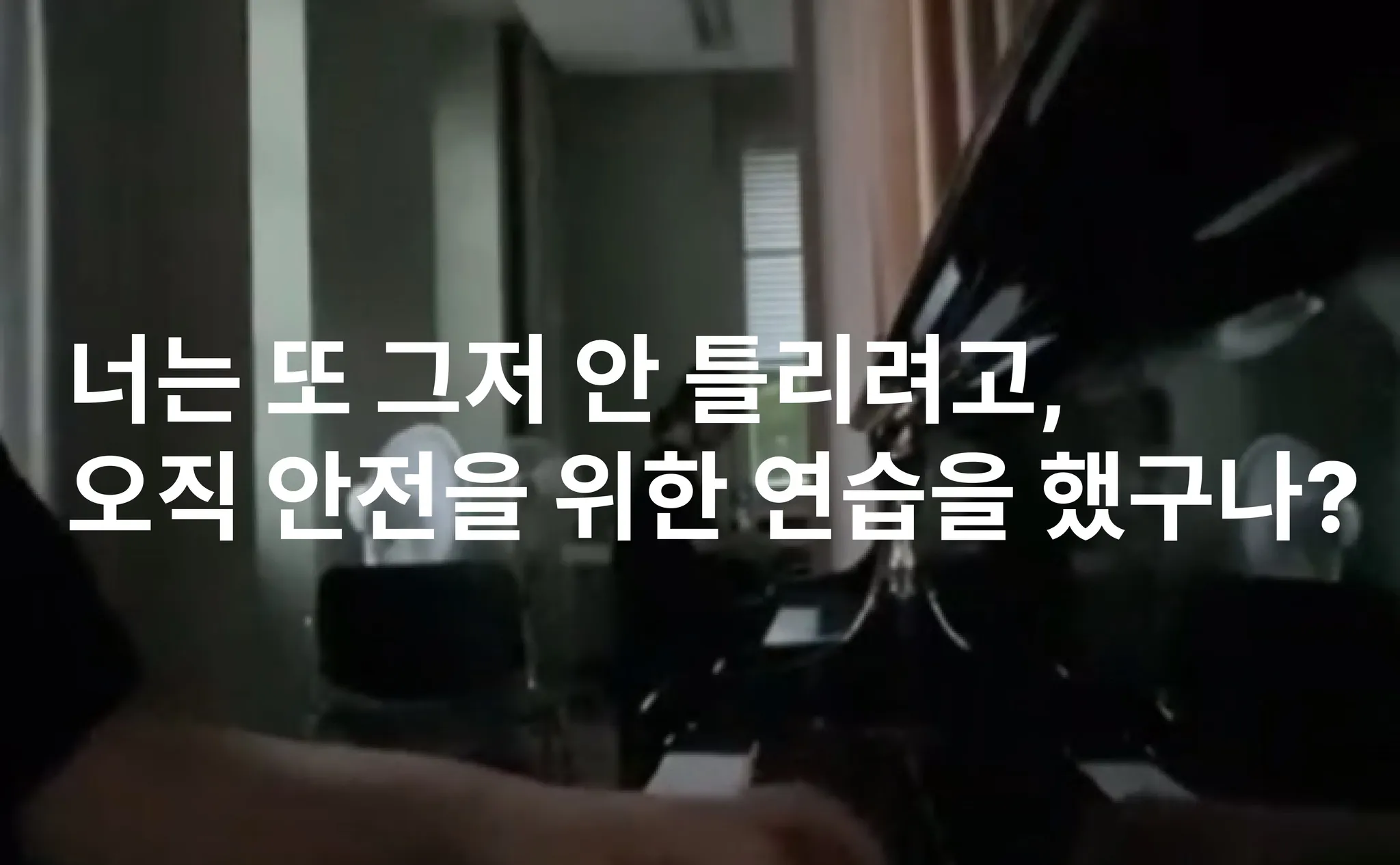 정민! 너는 또 그저 안 틀리려고, 오직 안전을 위한 연습을 했구나! 제발 생각을 해봐, 손가락이 아닌 팔을 쓰고 네 소리를 들어봐! 교수님은 곧 직접 시범을 보여주시고 이것이 음악이지라고 말하는 듯한 표정을 지으셨다.
