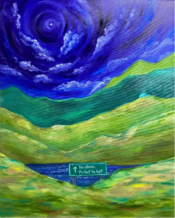 이 힘은 실제로 저에게 작용된 적이 있습니다. 몸의 근력처럼 마음 근력도 체계적이고 반복적으로 훈련하면 강해집니다 작품 속 굴곡진 길과 변화 많은 세계는 삶의 여정 속 “마음 영역” 입니다 울퉁불퉁한 마음 영역에 세운 표지판 속 말들은 마음을 훈련시켜주는 장치입니다.