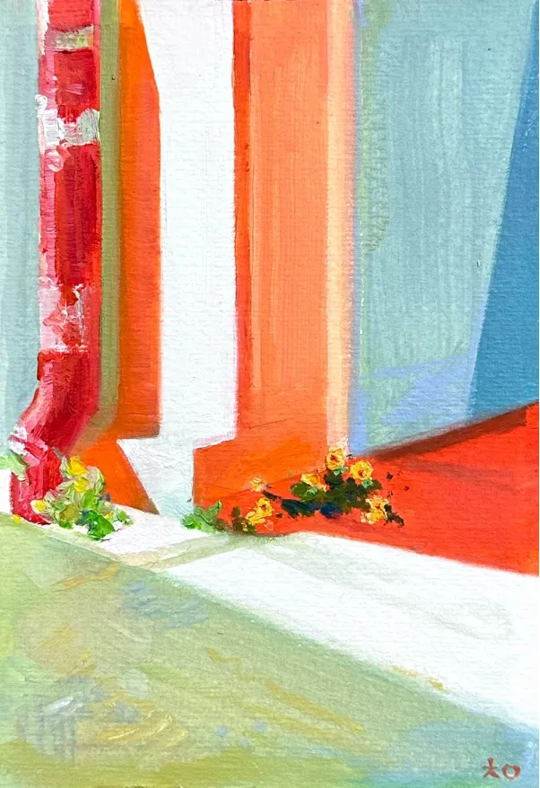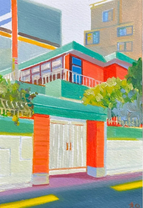 나는 주로 다양한 색채와 형태를 이용하여 일상을 바라본다. 우연히 그림에 사용하게 된 주황색은 캔버스 안에서 자유롭게 세상을 펼칠 수 있는 기회가 되었다. 반복되는 하루, 똑같은 걸음, 똑같은 동네에서의 지루한 풍경에서도 새롭게 느낄 수 있는 평범한 모양새들을 찾아 일상을 즐기게 되었다. 점차 여러 색깔을 탐방하는 마음으로 풍경을 바라보기 시작했다. 주황색을 비롯하여, 다양하게 어우러지는 색채와 유화의 은폐력은 일상에서 종종 마주하게 되는 근심 가득한 실제를 감추기에 충분했다. 그리하여 시선이 매우 일상적인 공간을 따라 흘러간다. 어떤 색을 더해도, 그것을 매료시키는 주황색의 힘이 부러웠다. 이후에 화면에서 기존의 색을 의식적으로 잃어버리기도, 오롯이 색채만을 추출하기도 했다. 상상 속의 색채를 가지고 현실과 조합하여 세상을 아름답게 보기 위한 시선을 키운다. 한 지붕 아래, 뜨거운 태양 아래서, 누가 사랑하고 누가 외로운지는 몰라도 사람 냄새나는 동네에서 조화를 찾고, 또 모두의 안녕을 기원하는 마음으로 그림을 그린다.