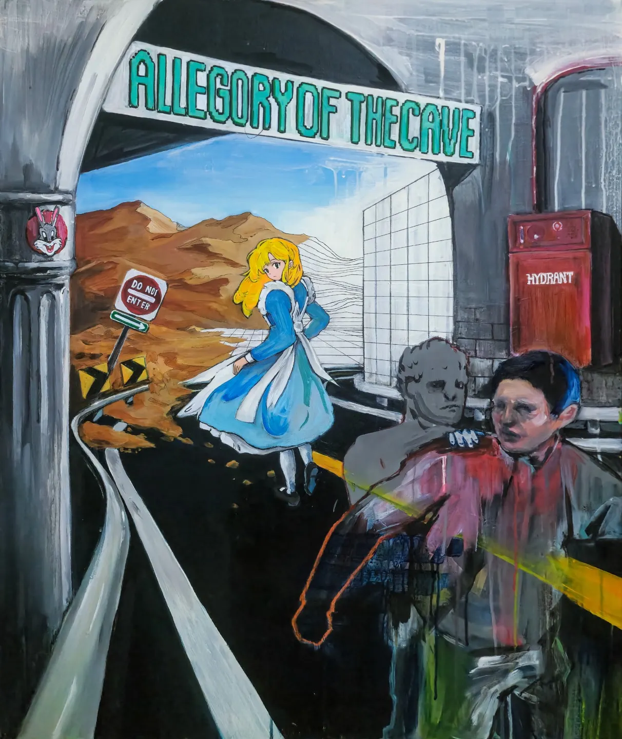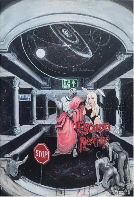 이 방식은 작가의 새로운 이데아의 구축으로 이어진다. 작품 속 인물들은 나아가는 방향이 각기 다르다. 스스로 현실로부터 도망치는 건지 혹은 이데아를 향한 탈출인지 정확하게 깨닫지 못하기 때문이다. 또한 작품 속 공간은 모호하고 경계가 정확하지 않다. 실제로 있을 법한 구조물이나 3d 그리드 공간 혹은 단순한 선과 면으로 이루어진 조형 위에 있기도 한다. 우리가 바라보는 세계를 의심하고 뜯어낸다. 벗겨진 세계는 보이는 것 외에도 많은 것들로 이루어져 있다.