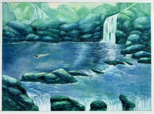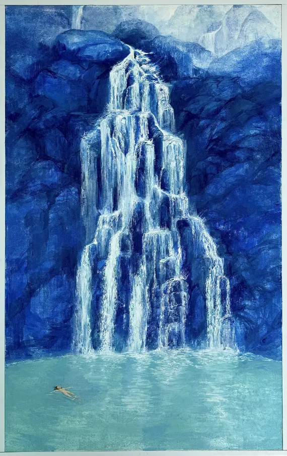 하나의 물줄기는 바위를 만나 감싸며, 넓어지고, 거세게 내리치다가 얌전히 흐른다. 물은 완전한 형태를 가지지 않고 다른 것에 온전히 자신을 맞춘다. 그러나 완전한 형태를 띄지 않아도 결국 폭포의 주인공은 ‘물’이 된다. 쏟아내리는 폭포는 자연의 규율 속에서 자유로움을 갖는다. 나는 이런 물성이 좋아 그림에 담아보았다. 또한 <푸른 폭포>는 장자의 ‘소요유(逍遙遊)’가 말하는 세속을 초월하는 ‘자유로운 정신의 노닐기’를 함의했으며 여러분이 작품을 감상할 때 목적과 한계도 없이 자유의 상태로 천지와 정신적으로 소통하길 바란다.