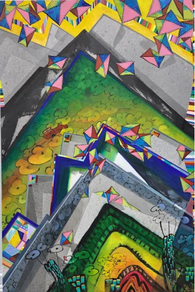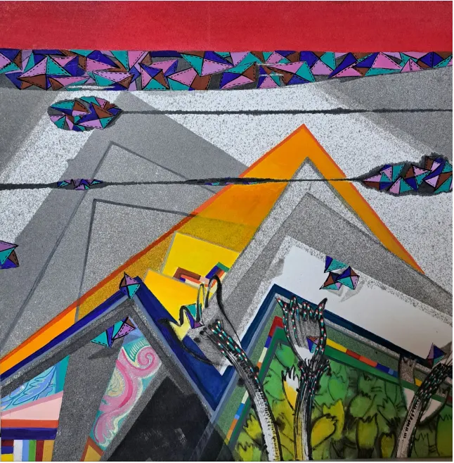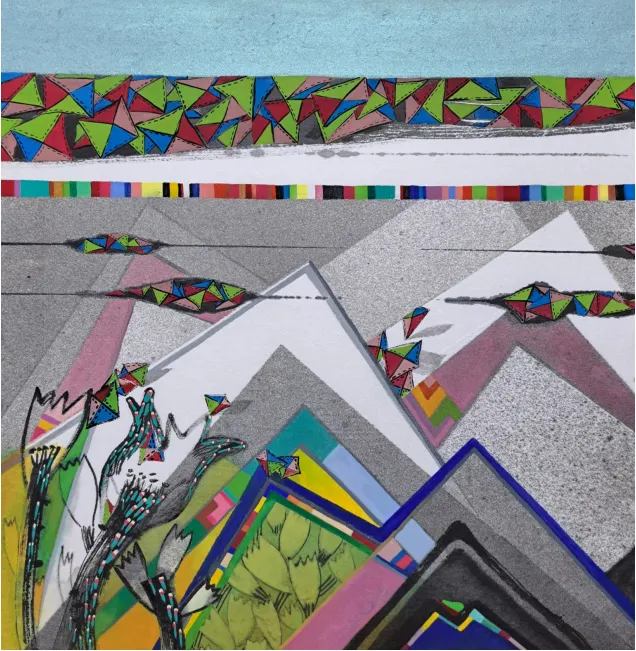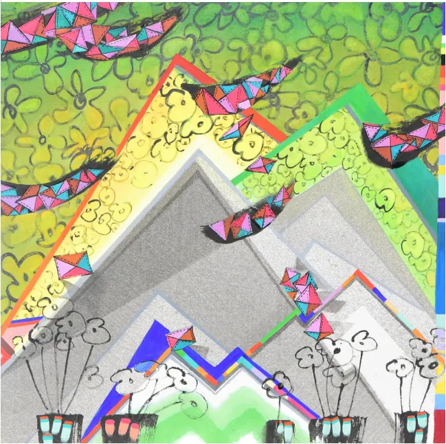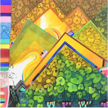 이번 2024. 소리없는 소리 part.2에서 연작 상생(相生) - position은 자연의 완벽한 아름다움을 작가는 산에서 찾았다. 한번의 오름으로 그 산을 다 알지 못하는 것처럼 연속된 작품으로 메시지를 담아 일곱 번의 오름으로 일곱 작품을 선보인다. 어수룩한 모양새의 조각보는 바람을 담은 산 풍경 안에 우리에게 한없이 편안하게 다가온다. 작품 속 색동은 좋은날 기쁜날 색동옷을 입은 행복 충만을, 산과 산이 만난 청산(靑山)은 행복의 고지이다. 바람과 햇살 그리고 생명의 삶을 상생의 궁극적 목표인 함께 행복한 청산(靑山)을 작품에 담았다.
