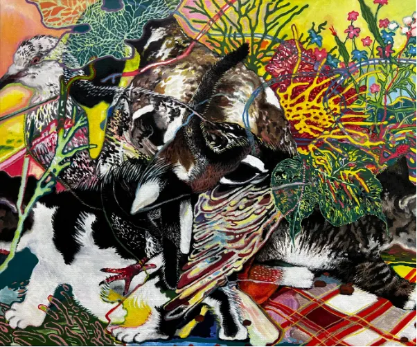 틈새를 들여다보고 무언가를 직접 만지는 과정을 통해 알게 된 존재들은 종이 아닌 특정한 개체 하나하나로 보이게 되며, 이윽고 나라는 존재도 독립적인 자신에서 타존재와 연결된다. 세상을 살아가는 존재들은 생각보다 빽빽하게, 어디선가는 느슨하게 뒤엉켜 있을지도 모른다. 나의 작업은 우리 주변을 살아가고 있는 타존재와 닿는 방법 중 하나이기도 하며, 이러한 태도는 꾸준한 응시와 붓질로써 작업 안의 개체 간 불규칙한 연관성으로 뒤섞여 드러난다. 물이 흐르듯 시선을 움직이며 작업을 바라보면 비현실적이지만 어딘가 현실과 중첩된 존재들이 보이기 시작하고, 점차 그들에게 다가갈 수 있을 것이다.