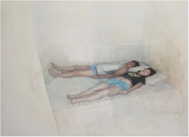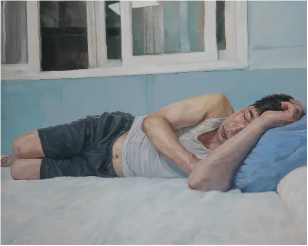 자는 가족들의 모습을 수집하게 된 계기가 무엇일까? 나는 그것이 내가 가지고 있는 내면의 외로움에서 시작되었다 생각한다. 이 외로움은 내가 홀로 남겨지게 될 것만 같은 불안함으로 변환되어 나의 가족들에게 표출되곤 했다. 특히 모두가 잠든 밤에 홀로 눈을 뜨고 누운 채 어둠을 올려다보고 있자면 불안함이 나를 발끝, 손끝에서부터 도무지 어찌할 수 없는 무게로 나를 저 밑의 바닥으로 끌어내렸다. 그 무거움 속에서 나는 손 하나를 뻗어 옆에 누워 자는 가족의 오므려진 손 사이에 내 손을 비집어 넣고 자꾸만 식는 내 손의 모든 면에 그 온기를 담고 자 계속해서 부대꼈다. 손에서 전해져 오는 그들의 맥박 소리와 조용하게 반복되는 숨소리를 느끼며 그들이 이 공간에 존재함을 확인하고 그 따뜻함에 나의 마음을 기대곤 했다. 하지만 그 순간의 위안은 그 리 오래가지 못한다. 자신의 모습 그대로 굳은 채 늘어져 자는 그들의 품과 손은 내가 힘을 풀면 나를 놓고 원상태로 돌아간다. 나를 온전히 감싸주지 못하는 그들의 느슨한 온기는 이 순간마저 사라져 다시 홀로 남게 될 것 같은 불안함으로 다시 돌아갔다. 세상을 살아가는 누구나 홀로 감당해야 하는 각자의 외로움이 있을 것이다. 잠을 자는 모습을 그리며 나는 외로움을 마주한다. 나아가 이 그림을 보는 사람들 각자의 불안함까지 위로할 수 있기를 희망한다.