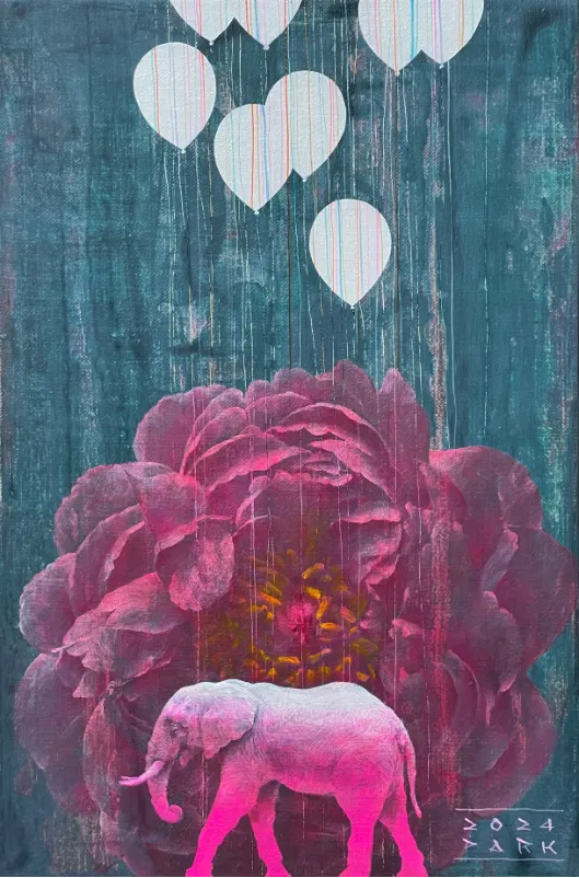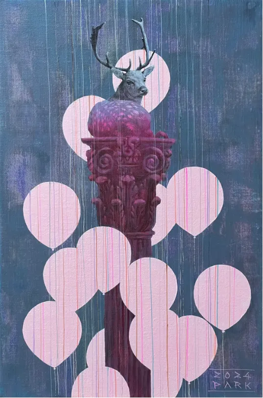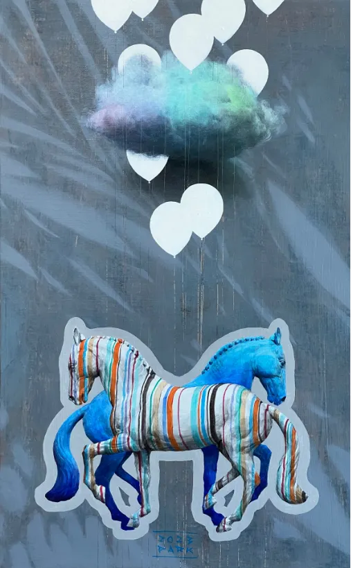 생명의 가장 절정의 순간인 꽃, 희망과 추억의 풍선과 구름, 자유의 날개와 깃털, 달리고 싶은 말, 신비로운 사슴, 비현실적인 코끼리 등등의 친숙한 사물들을 낯선 환경속에 함께 배치하고 그들과 이어진 선들이 시간을 멈춰버린 듯 벽처럼, 커튼처럼 순간을 무한히 연장시킨다.