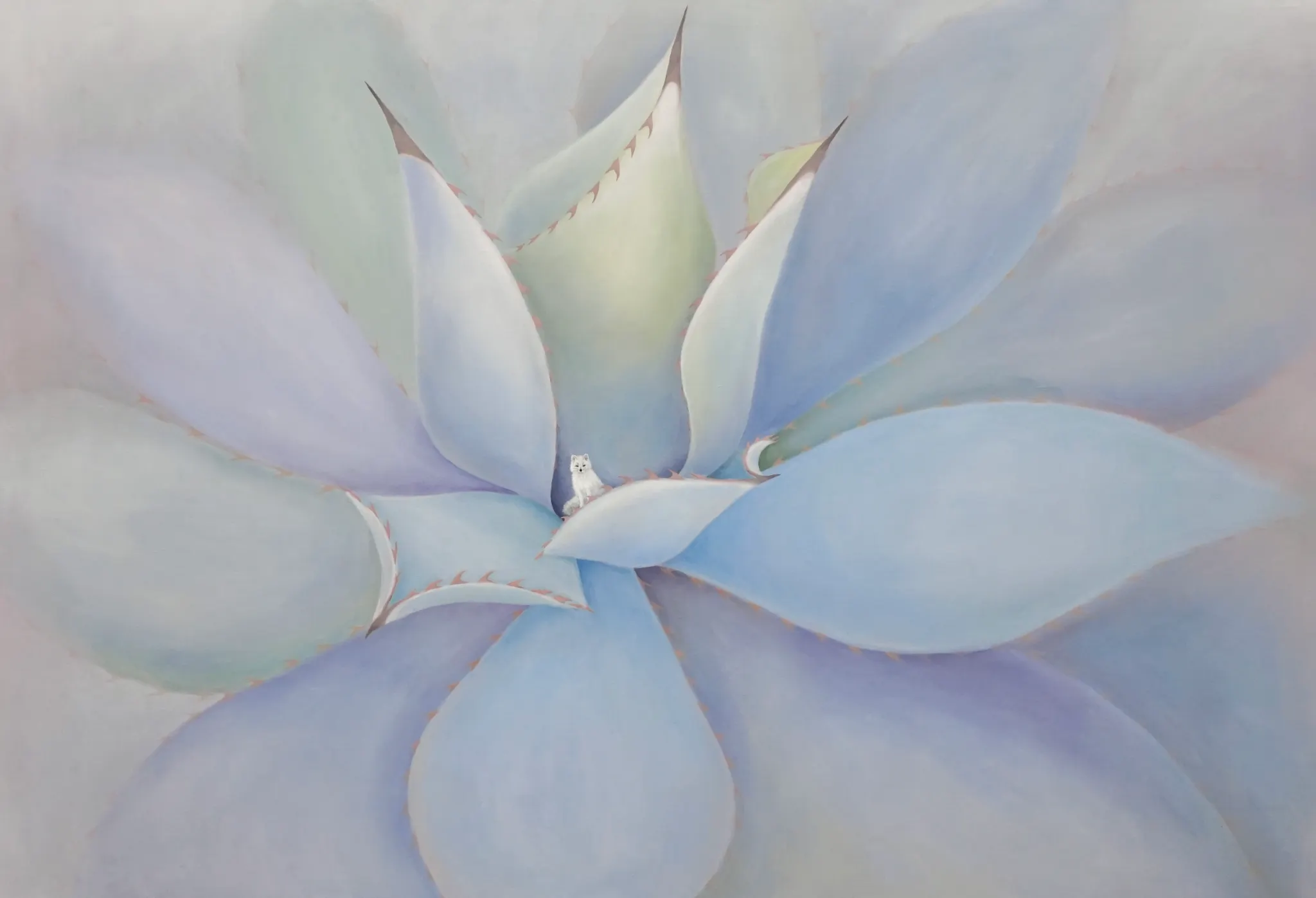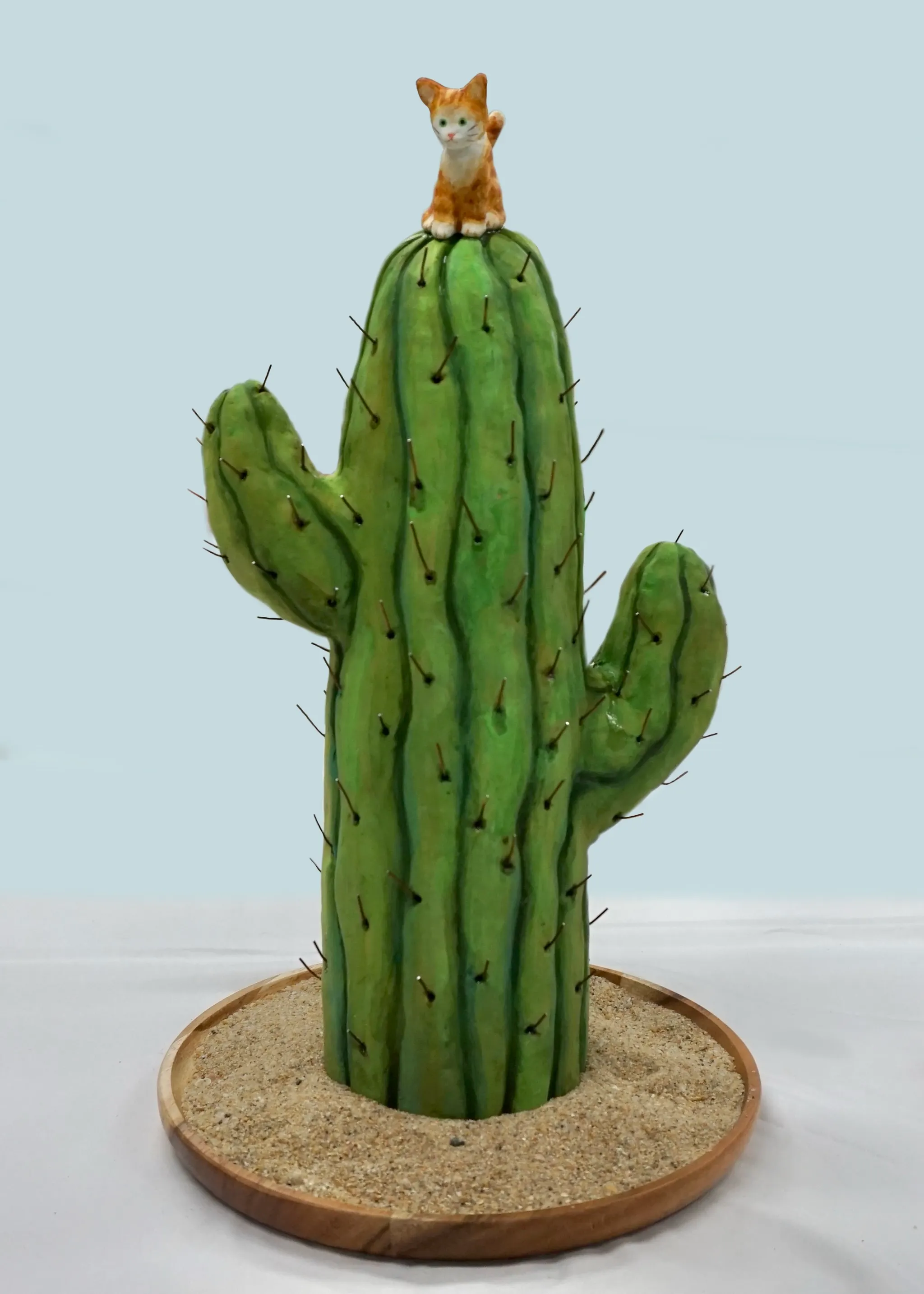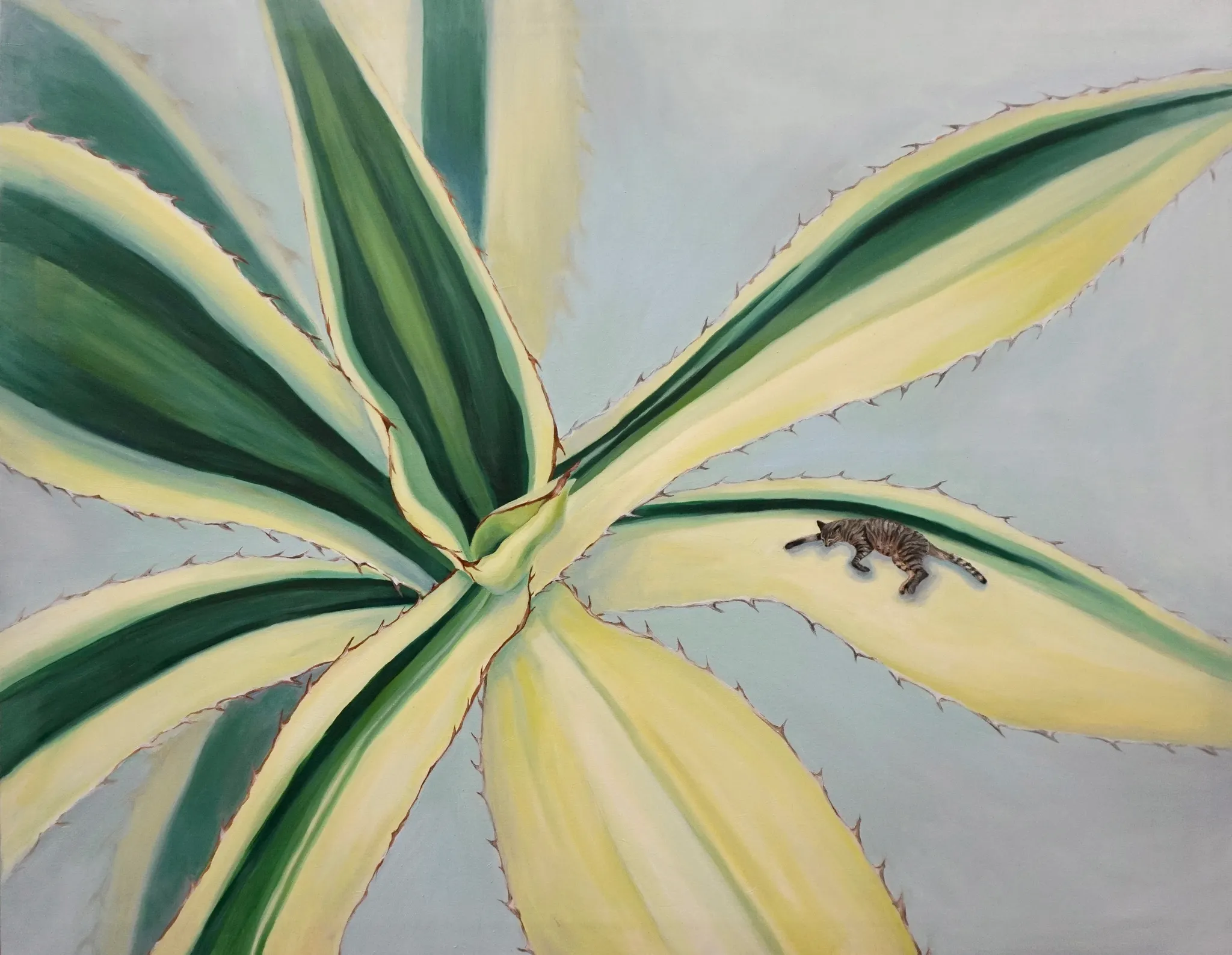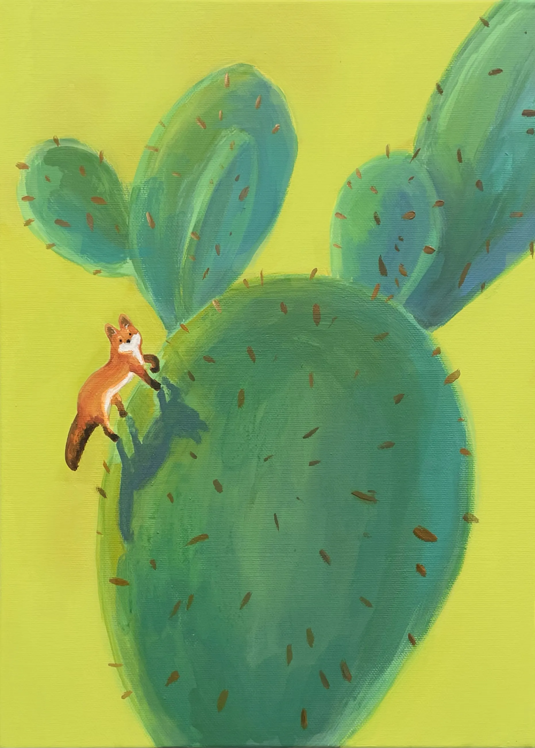 선인장 위에 올라서 있는 고양이는 그 자체로 나에게 위로•위안 등 치유를 주는 존재로서의 상징적 의미를 가진다. 그런 존재로 인해 굳어있는 마음이 서서히 녹아내리며 위로받는 것을 표현하고 싶었다. 동물을 정말 좋아하기도 하고, 동물들은 말은 통하지 않아도 곁에 있는 것만으로 위안이 되는 듯한 느낌을 받았던 나의 경험에서 기인하였다.