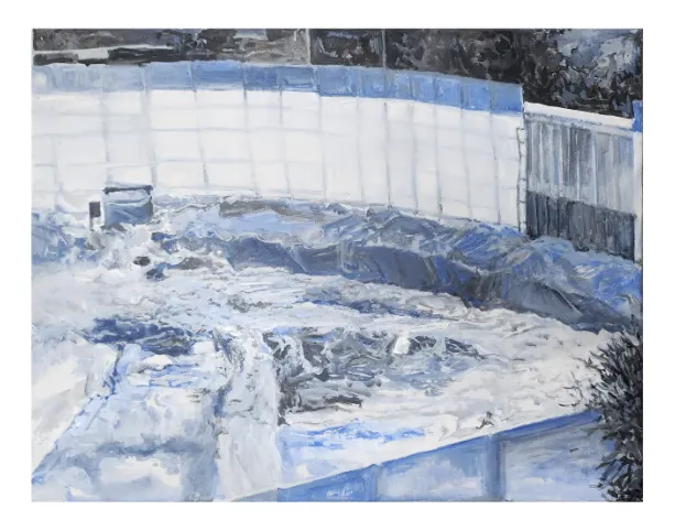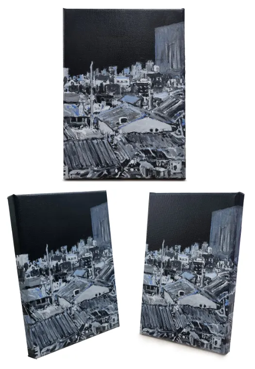 본인은 아크릴 특유의 불투명하고 선명한 색감과 중첩 가능한 두터운 물성에서 <건물의 흔적>을 그려내는 과정을 도전 중이다. 푸른색의 이미지 자체는 정적인 느낌이 들지만, 우리는 그 안에서 무수한 소리가 존재하는 공사장과 건물임을 알 수 있으며, 본인은 작품에서 관찰자를 넘어 '관조'하는 하나의 기록을 보여주고자 한다.